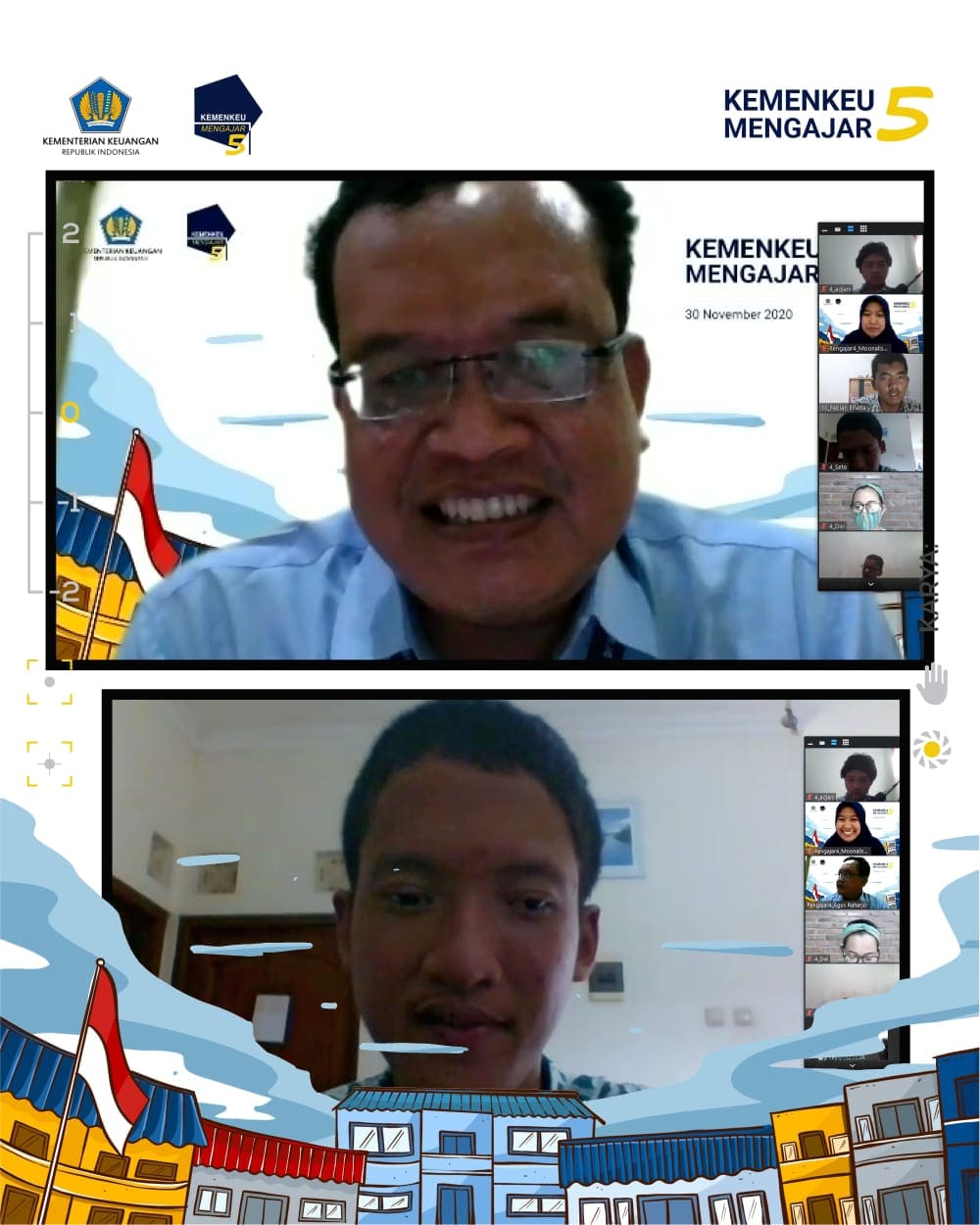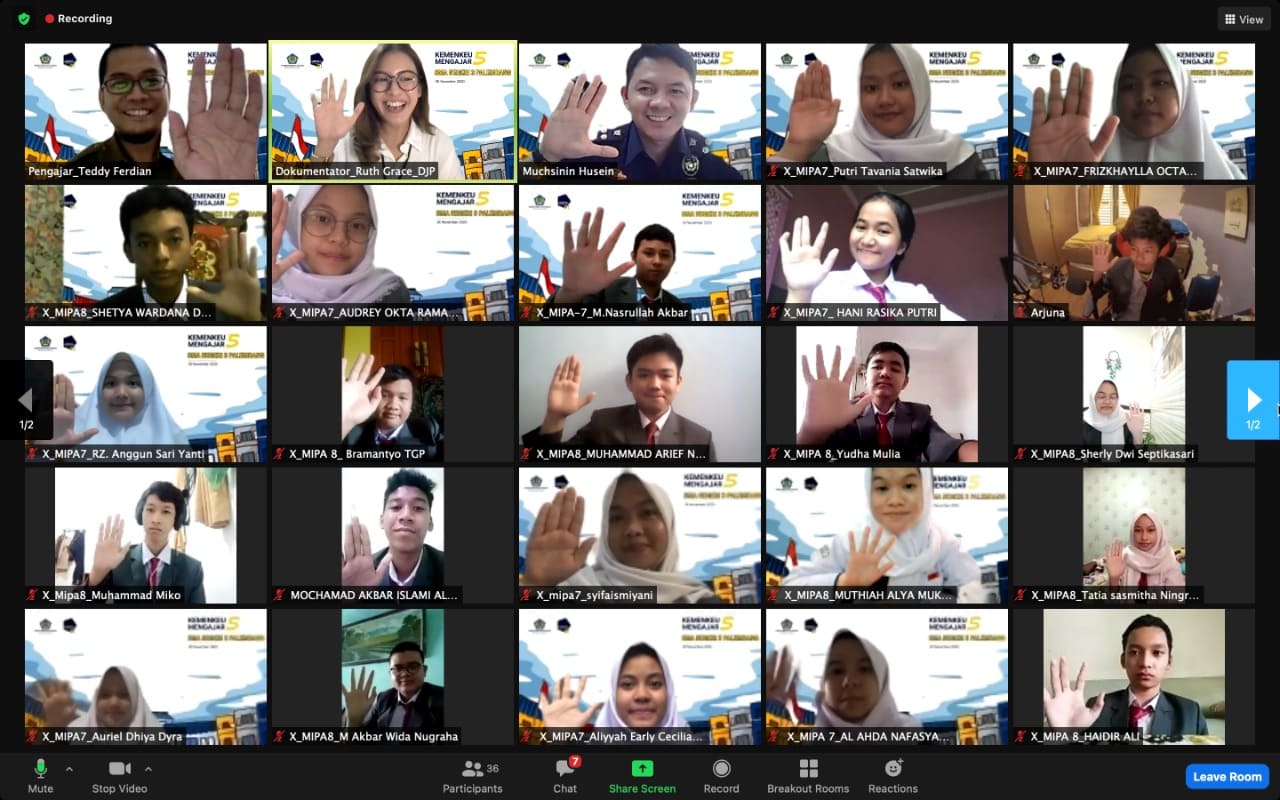 Sebanyak 1250 pegawai Kementerian Keuangan ikut serta dalam kegiatan tahunan bertajuk Kemenkeu Mengajar 5 di berbagai daerah di Indonesia (Senin, 30/11). Kegiatan yang tahun ini dilakukan secara daring ini melibatkan 84 sekolah dari seluruh Indonesia. Menteri Keuangan, Sri Mulyani Indrawati, turut serta menjadi pengajar dalam kegiatan ini.