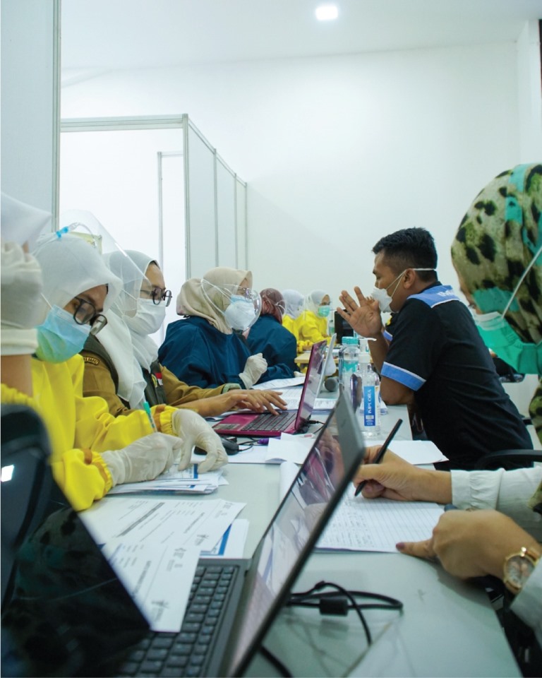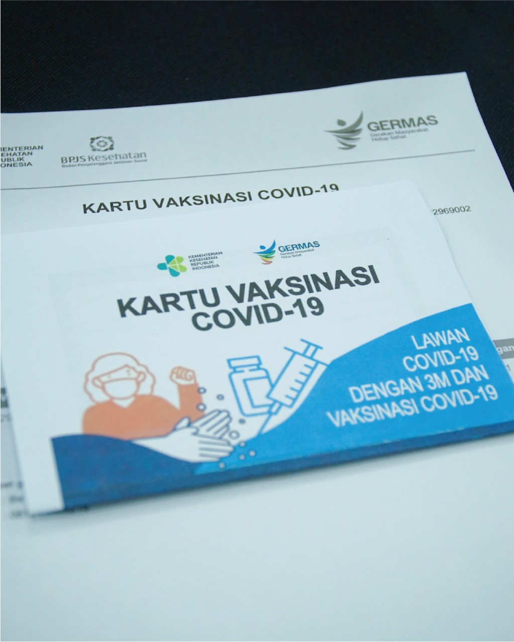 Tahap selanjutnya penyuntikan vaksin, para pegawai yang telah dinyatakan boleh mendapat vaksin oleh petugas screening kemudian dilakukan penyuntikan vaksin. Dan tahap terakhir pencatatan, para pegawai yang telah mendapat vaksin menunggu 30 menit sebagai antisipasi bila ada KIPI (Kejadian Ikutan Pasca Imunisasi) dan para pegawai penerima vaksin mendapat kartu vaksinasi Covid-19.