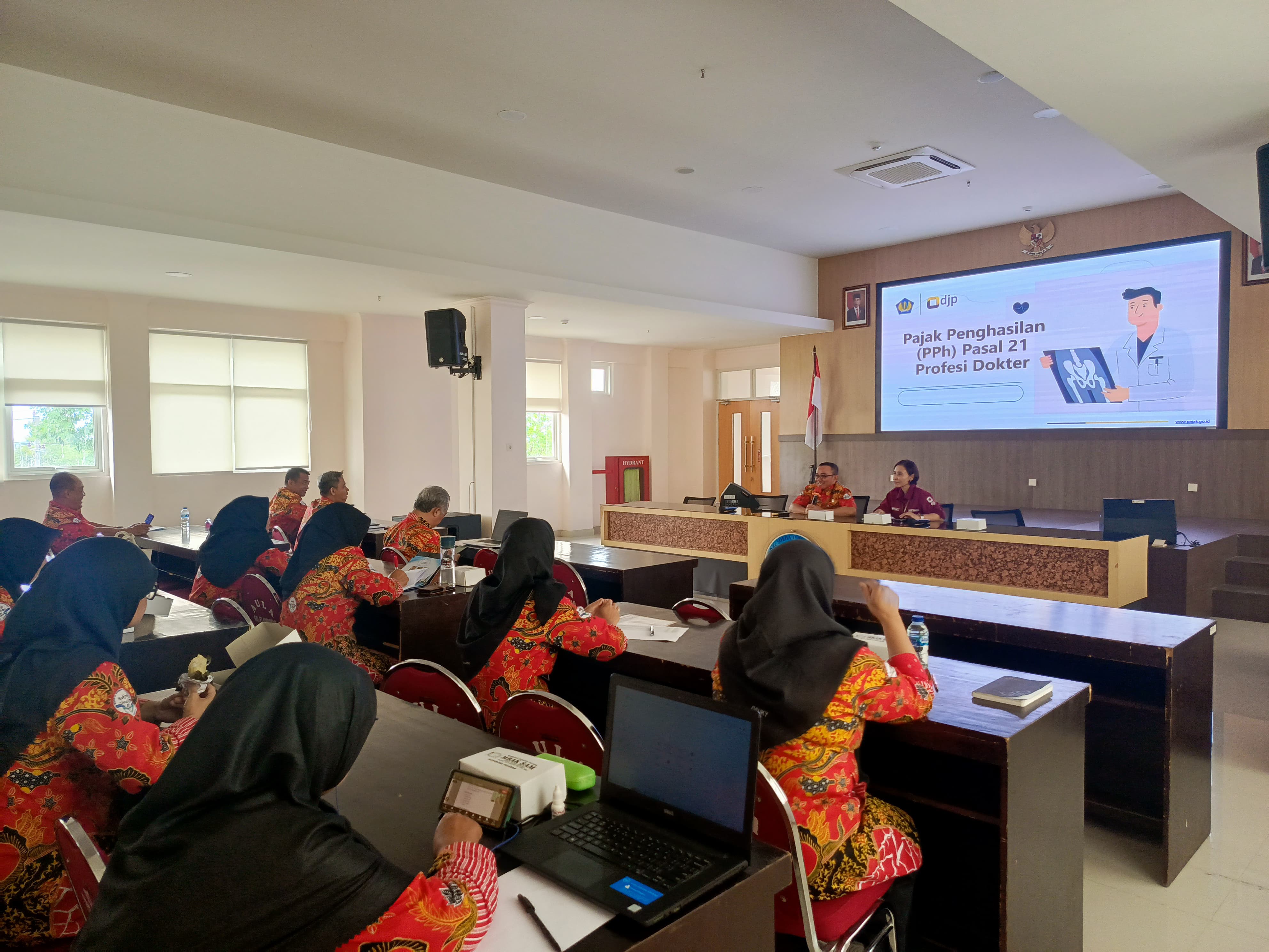 Penyuluh Pajak Kantor Pelayanan Pajak (KPP) Pratama Karanganyar melakukan kegiatan edukasi di Rumah Sakit Umum Daerah (RSUD) dr.Soehadi Prijonegoro Sragen (Kamis, 7/3). Kegiatan dilaksanakan di Ruang Aula Asoka mulai pukul 13.00 WIB hingga pukul 15.00 WIB. Hadir dalam kegiatan tersebut sebagai peserta kegiatan yakni dokter, pejabat struktural dan staf RSUD. Tema yang diangkat dalam kegiatan edukasi adalah ketentuan terkait perpajakan PPh 21 bagi pegawai dan dokter.