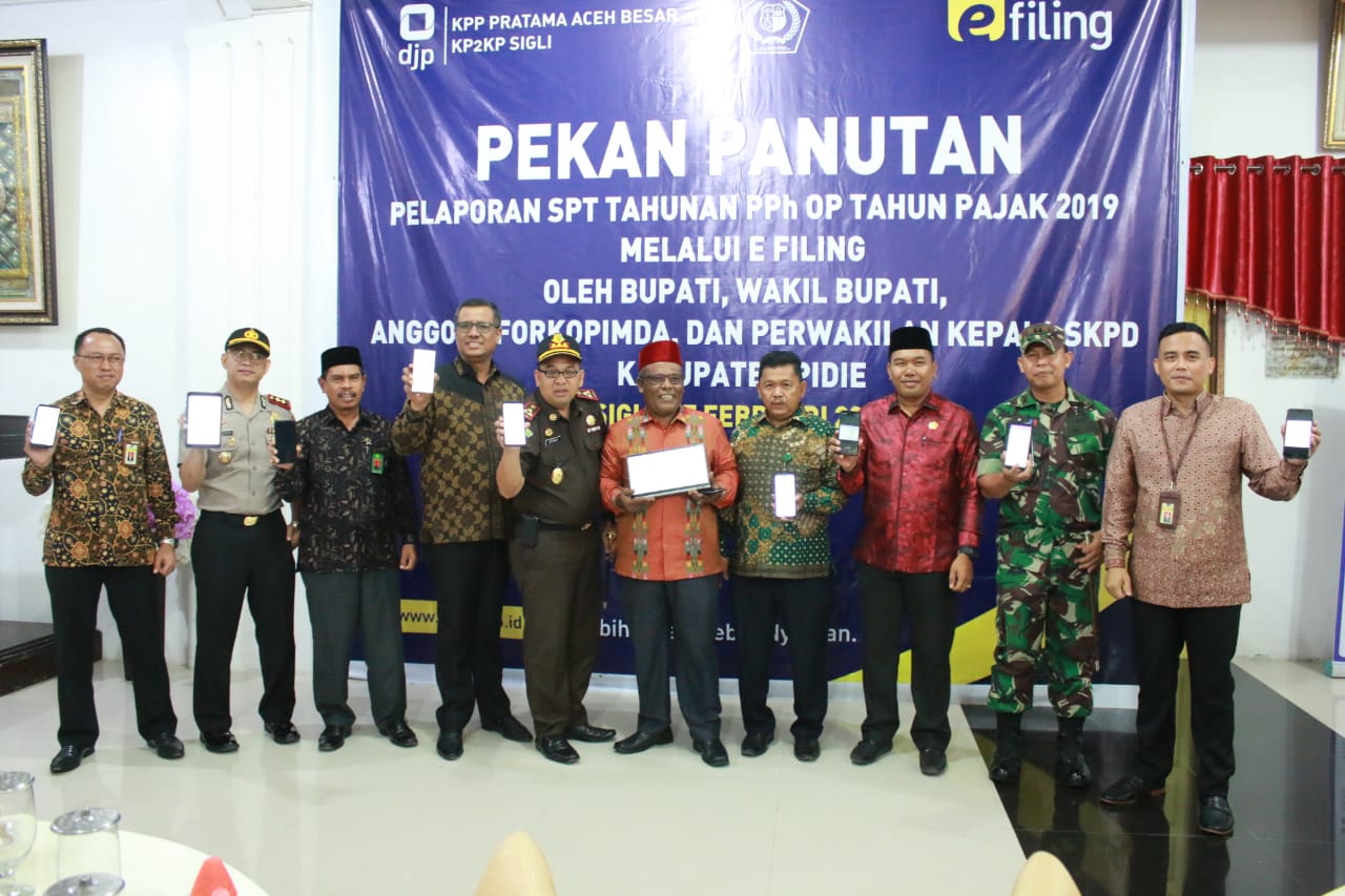 Pada kegiatan ini, Bupati, Wakil Bupati, Anggota Forum Komunikasi Pimpinan Daerah (Forkopimda), dan perwakilan Kepala Satuan Kerja Perangkat Daerah (SKPD) Kabupaten Pidie menyampaikan SPT Tahunan PPh Orang Pribadi Tahun Pajak 2019 melalui e-Filing.