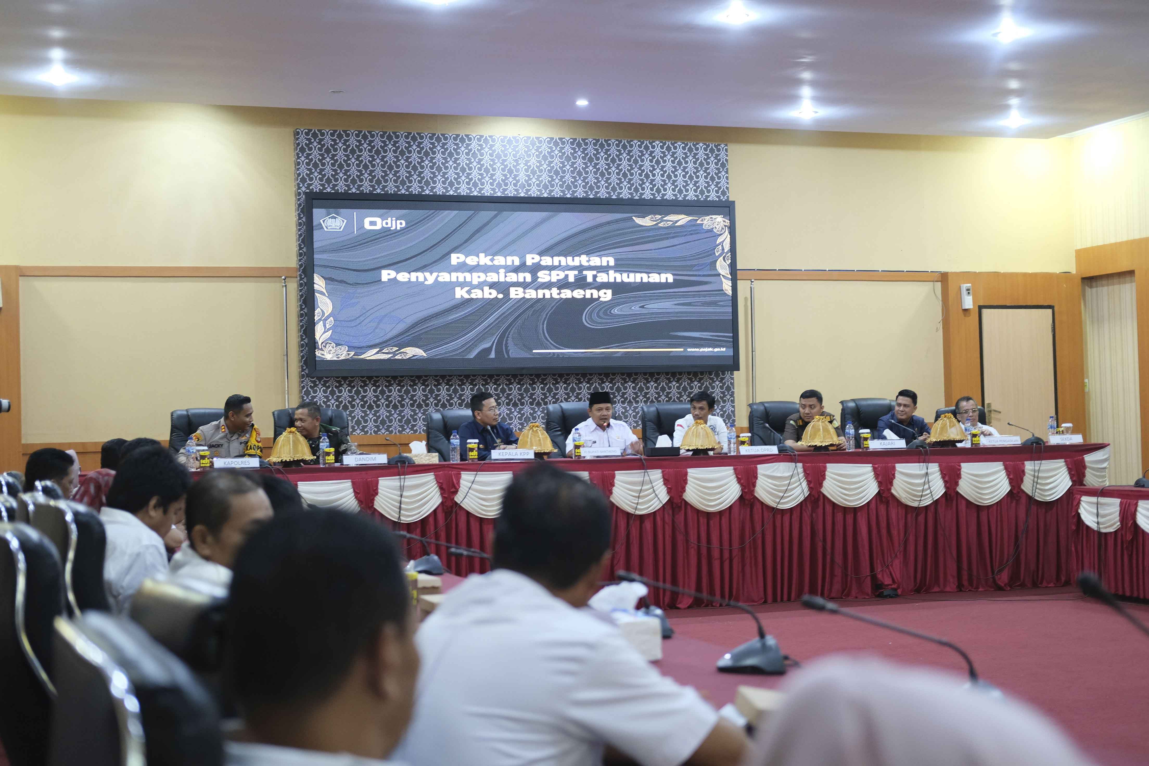 Kantor Pelayanan Pajak (KPP) Pratama Bantaeng bersama Penjabat (Pj.) Bupati Bantaeng dan seluruh jajaran Pemda menyelenggarakan kegiatan Pekan Panutan Penyampaian SPT Tahunan di Ruang Pola Kantor Bupati Bantaeng (Rabu, 21/2).