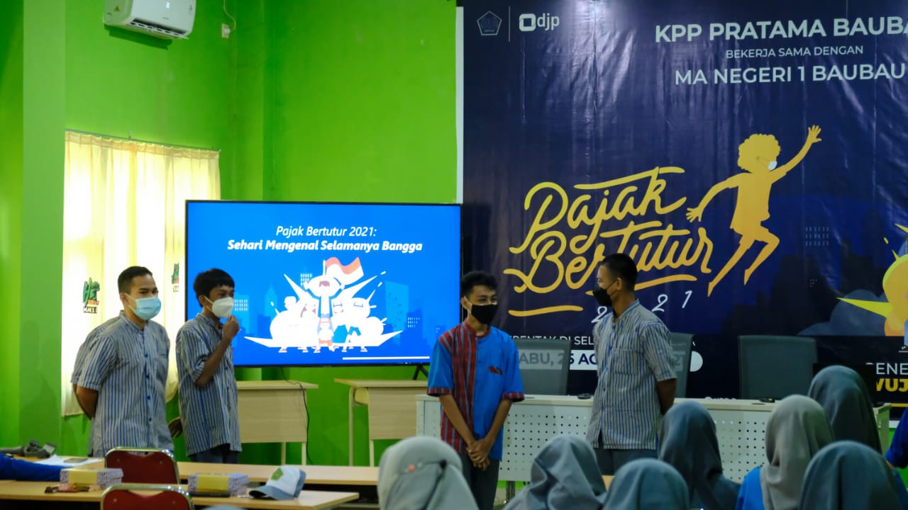 Kantor Pelayanan Pajak (KPP) Pratama Baubau melaksanakan kegiatan Pajak Bertutur dengan menggandeng Madrasah Aliyah Negeri (MAN) 1 Baubau (Rabu, 25/8). Kegiatan ini dilangsungkan secara luring dengan penerapan protokol kesehatan Covid-19 di ruang aula MAN 1 Baubau, Kota Baubau.