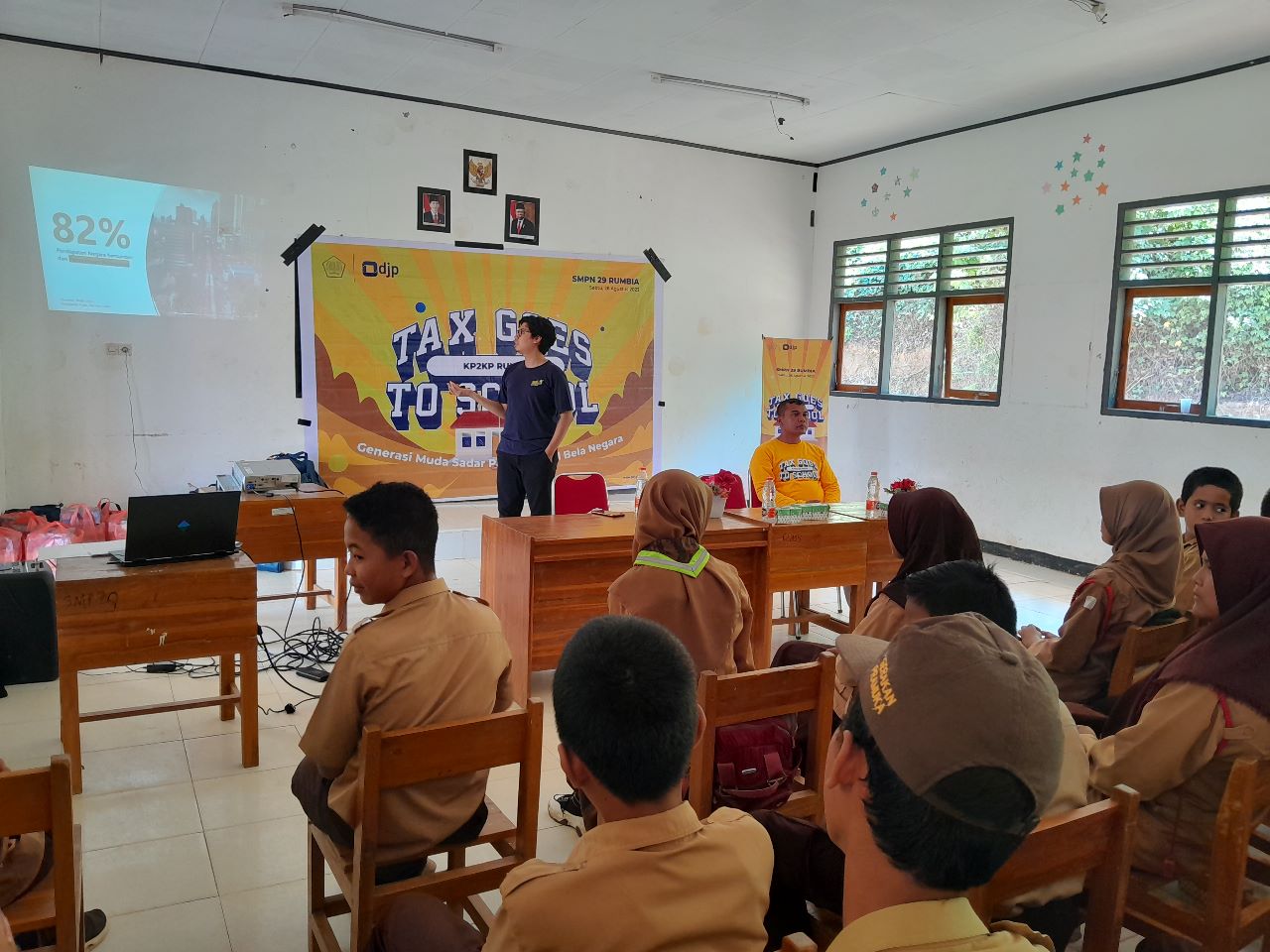 Kantor Pelayanan, Penyuluhan, dan Konsultasi Perpajakan (KP2KP) Rumbia menyelenggarakan Tax Goes To School di Aula Sekolah Menengah Pertama Negeri (SMPN) 29 Rumbia di Kabupaten Bombana, Provinsi Sulawesi Tenggara (Sabtu, 26/8).
