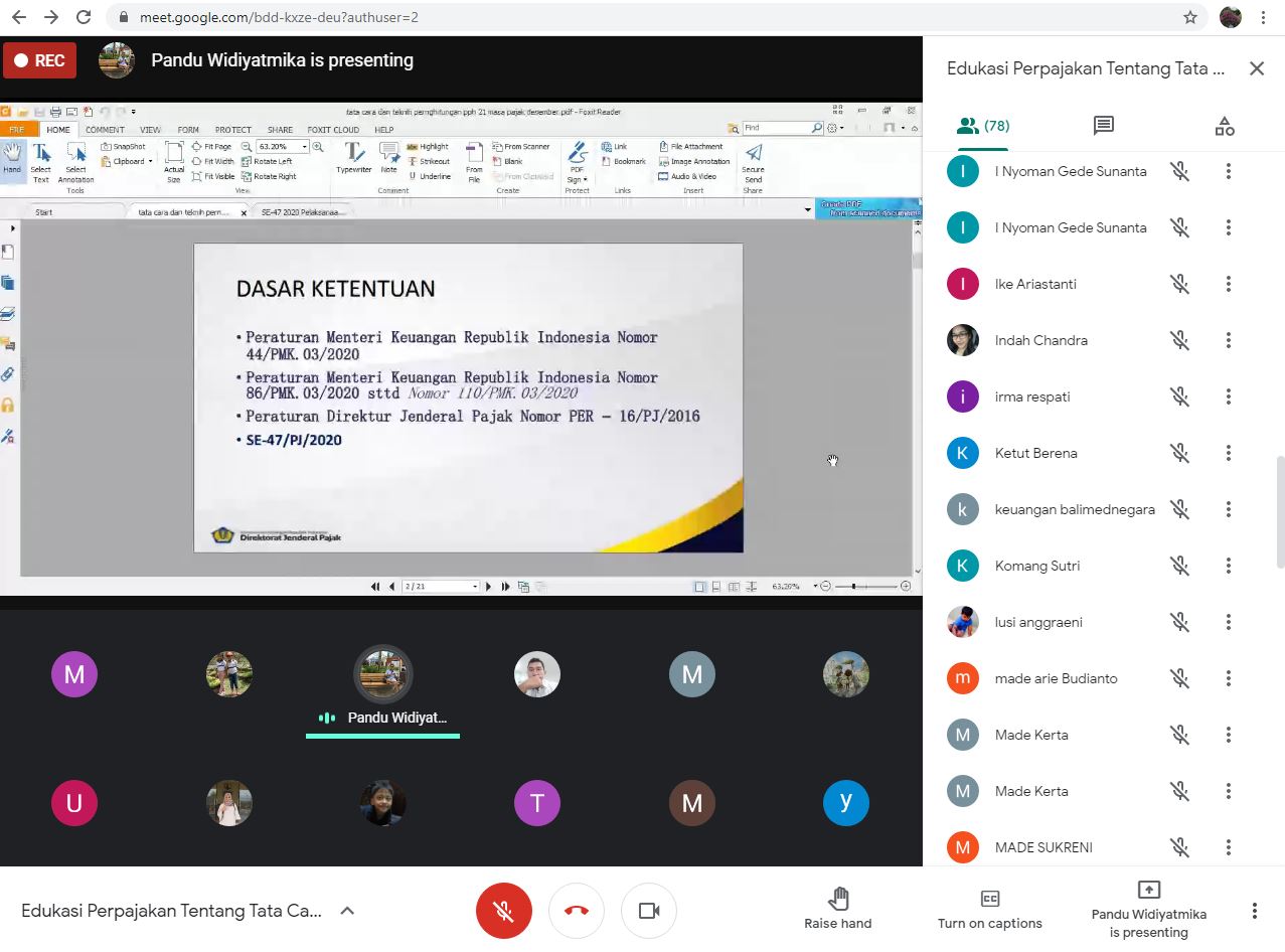 Kantor Pelayanan Pajak (KPP) Madya Denpasar mengadakan kegiatan Edukasi Perpajakan Daring mengenai Tata Cara Pembuatan Bukti Potong PPh Pasal 21 Ditanggung Pemerintah (DTP) (Kamis, 25/2). Acara ini dilangsungkan melalui aplikasi Google Meet di Kota Denpasar dengan peserta sejumlah 95 wajib pajak pemberi kerja dari berbagai sektor.