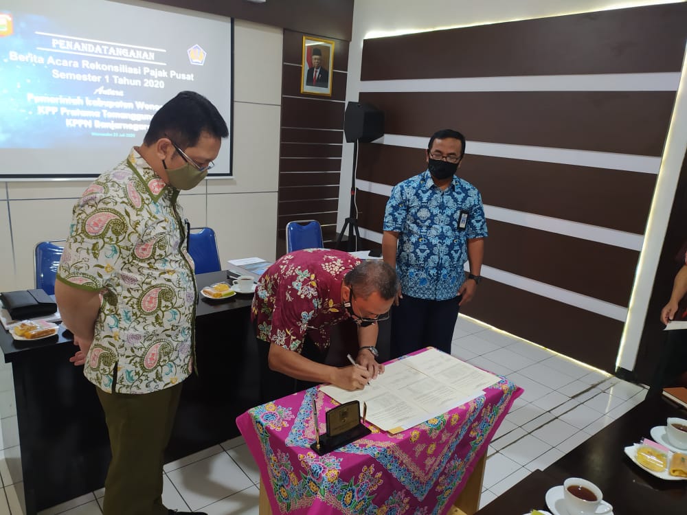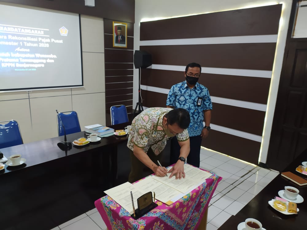 Kepala KPP Pratama Temanggung bersama dengan Pemerintah Daerah (Pemda) Kabupaten Wonosobo dan KPPN Banjarnegara melakukan penandatanganan rekonsiliasi penyetoran pajak pusat semester I tahun 2020 di ruang rapat BPKAD Kabupaten Wonosobo (Kamis, 23/7).