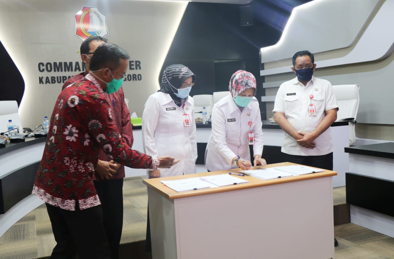 Mewakili Bupati Bojonegoro, Sekretaris Daerah (Sekda) Bojonegoro Nurul Azizah mengikuti seremoni penandatanganan Perjanjian Kerja Sama secara daring melalui aplikasi zoom di ruang Command Centre Gedung Pemkab Bojonegoro, Jalan Mas Tumapel No. 1, dengan didampingi Asisten Administrasi dan Umum Yayan Rohman, Kepala Dinas Pendapatan Daerah (Dipenda) M. Ibnu Soeyoeti, Sekretaris Dipenda Dilli Tri Wibowo, serta Staf Ahli Ninik Susmiyati.