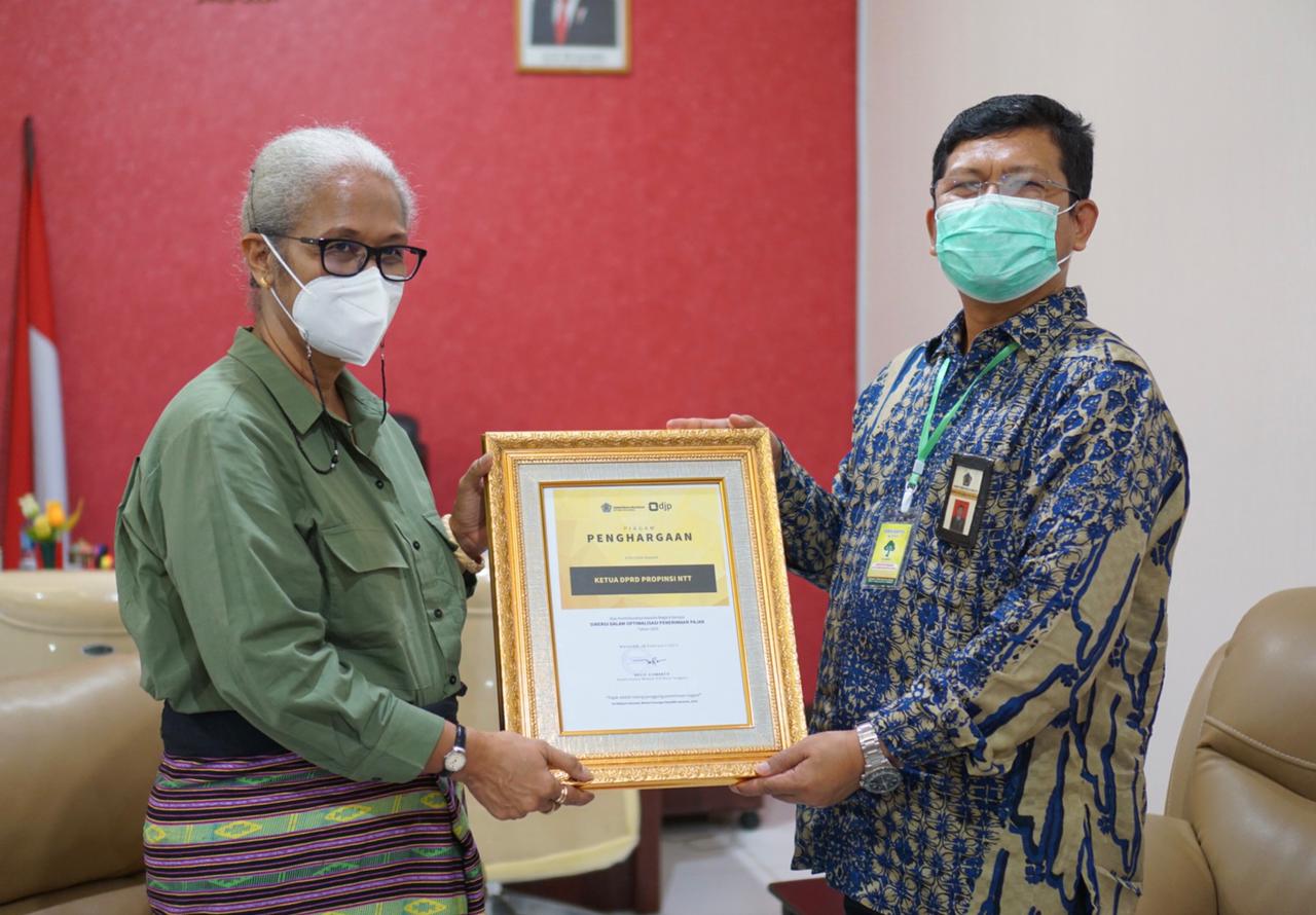 Kepala Kantor Pelayanan Pajak (KPP) Pratama Kupang Moch. Luqman Hakim menyampaikan penghargaan dari Kepala Kantor Wilayah DJP Nusa Tenggara Belis Siswanto kepada Ketua Dewan Perwakilan Rakyat Daerah Provinsi NTT (DPRD Provinsi NTT) Emelia Julia Nomleni di ruang kerja Ketua DPRD Provinsi NTT (Selasa, 2/3). Penghargaan ini diberikan sebagai apresiasi atas sinergi dalam optimalisasi penerimaan pajak tahun 2020.
