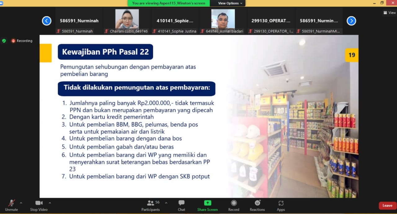Kantor Pelayanan Pajak (KPP) Pratama Kisaran bekerja sama dengan Kantor Pelayanan Perbendaharaan Negara (KPPN) Tanjung Balai dan Kantor Pelayanan, Penyuluhan, dan Konsultasi Perpajakan (KP2KP) Tanjung Balai menyelenggarakan kegiatan edukasi perpajakan kepada unit-unit kerja mitra KPPN Tanjung Balai secara daring melalui aplikasi Zoom Meeting dari KPP Pratama Kisaran, Kabupaten Asahan, Sumatera Utara (Kamis, 14/10).