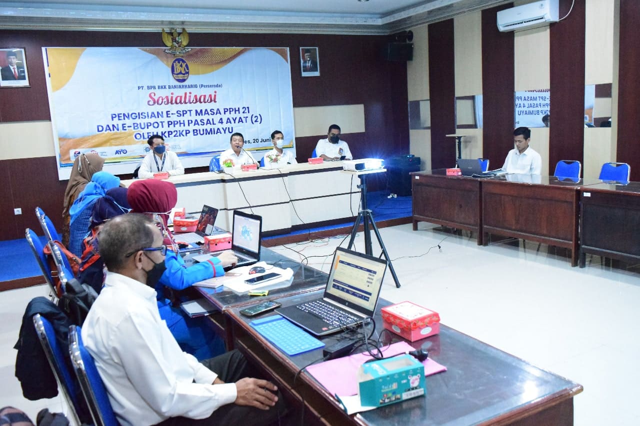 Kantor Pelayanan, Penyuluhan, dan Konsultasi Perpajakan (KP2KP) Bumiayu menghadiri undangan Direktur Utama PT. BPR BKK Banjarharjo (Perseroda) untuk menjadi narasumber dalam kegiatan Sosialisasi Pengisian e-SPT Masa Pajak Penghasilan (PPh) Pasal 21 dan e-Bupot Unifikasi. cara berlangsung di Aula Kantor Pusat PT. BPR BKK Banjarharjo (Perseroda) Jalan P. Diponegoro No.28, Pesantunan, Wanasari, Kabupaten Brebes, Jawa Tengah (Senin, 20/6).