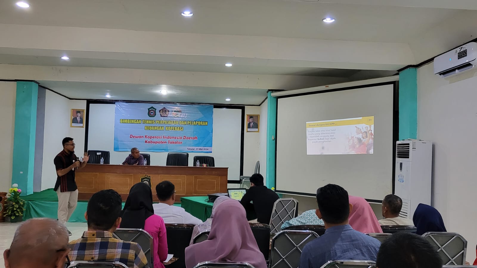 Kantor Pelayanan, Penyuluhan, dan Konsultasi Perpajakan (KP2KP) Takalar bersama Penyuluh Kantor Pelayanan Pajak (KPP) Pratama Bantaeng memenuhi undangan Dewan Koperasi Indonesia Daerah (Dekopinda) Kabupaten Takalar untuk menjadi salah satu narasumber dalam kegiatan Bimbingan Teknis Laporan Keuangan Koperasi yang bertempat di Gedung PKK Kabupaten Takalar (Kamis, 23/5). Kegiatan ini dihadiri 30 peserta yang terdiri dari pengurus koperasi di wilayah kabupaten Takalar.