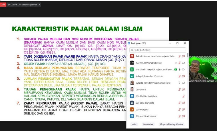 Kantor Wilayah Direktorat Jenderal Pajak (Kanwil DJP) Sumatera Barat dan Jambi melalui Fungsional Penyuluh Pajak Ahli Madya, Gusfahmi, menjadi narasumber Pajak Menurut Syariah pada kegiatan Internalisasi Corporate Value Kantor Wilayah DJP Kalimantan Barat yang dilaksanakan secara daring melalui Aplikasi Zoom Meeting (Kamis, 7/4).