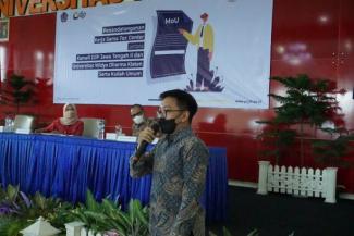 Asisten Penyuluh Kantor Pelayanan Pajak Pratama Klaten memberikan edukasi perpajakan kepada mahasiswa Universitas Widya Dharma dalam acara Peresmian Tax Center di Aula Universitas Widya Dharma (Rabu, 24/11).