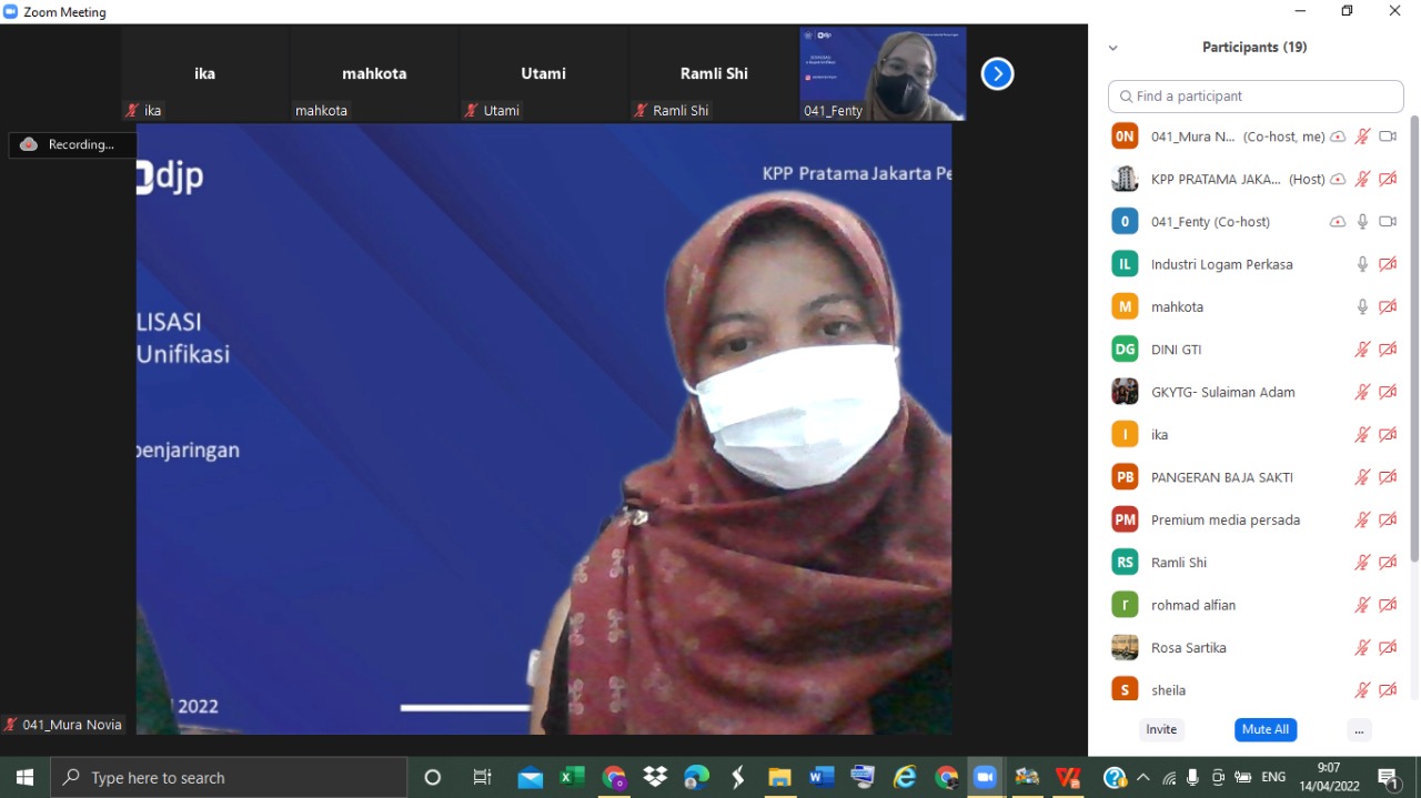 Penyuluh Kantor Pelayanan Pajak (KPP) Pratama Jakarta Penjaringan melaksanakan sosialisasi tentang Surat Pemberitahuan (SPT) Unifikasi di Jakarta (Kamis, 14/4). Sosialisasi yang dilaksanakan secara daring ini diikuti 24 wajib pajak.