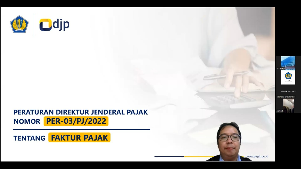 KPP Pratama Jakarta Tamansari mengadakan sosialisasi tentang Faktur Pajak secara daring melalui zoom meeting KPP Pratama Jakarta Tamansari di Jakarta (Rabu, 14/9). Sosialisasi dengan materi dua perubahan penting dalam Peraturan Direktur Jenderal Pajak nomor PER-11/PJ/2022 dimulai pukul 09.00 WIB dengan pemateri Asisten Fungsional Penyuluh Pajak Mahir Divanda Eka Putra dan Asisten Penyuluh Pajak Terampil Dafit Khoirul Rusda .