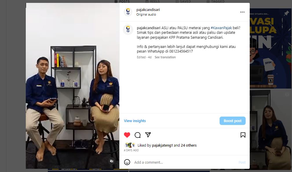Tim Penyuluh Pajak Kantor Pelayanan Pajak (KPP) Pratama Semarang Candisari mengedukasi kawan pajak dan masyarakat pada umumnya agar teliti sebelum membeli meterai melalui siaran langsung Instagram (IG) KPP Pratama Semarang Candisari pukul 16.00 WIB hingga selesai (Rabu, 11/10).