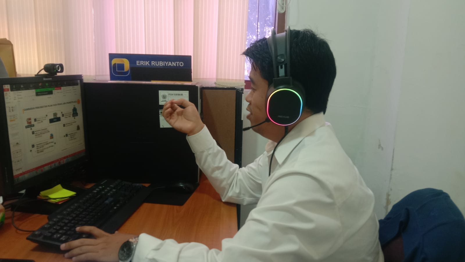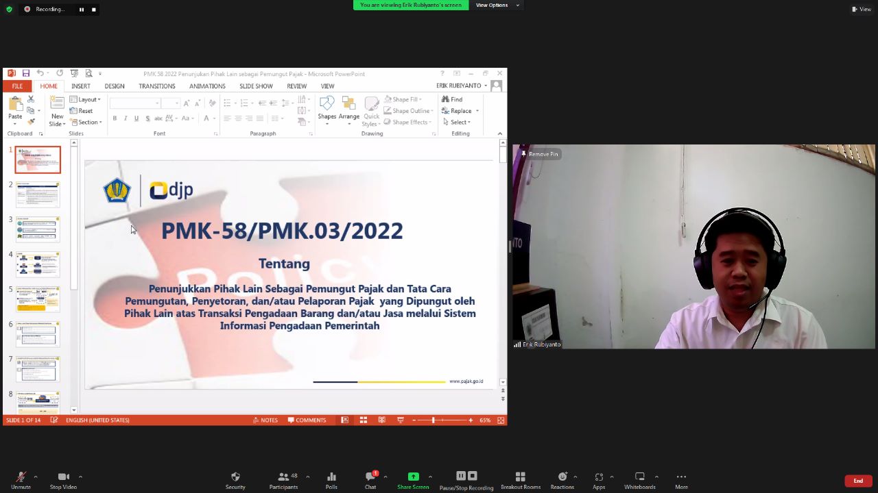 Penyuluh Pajak Erik Rubiyanto menyampaikan materi Peraturan Menteri Keuangan Nomor 58/PMK.03/2022 Tentang Penunjukan Pihak Lain Sebagai Pemungut Pajak Dan Tata Cara Pemungutan, Penyetoran, dan/atau Pelaporan Pajak Yang Dipungut Oleh Pihak Lain Atas Transaksi Pengadaan Barang Dan/ Atau Jasa Melalui Sistem Informasi Pengadaan Pemerintah.