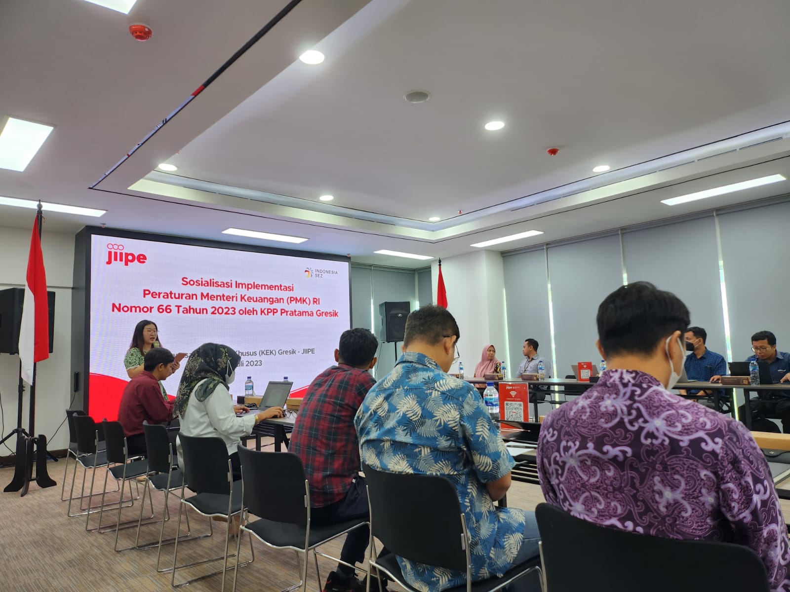 Kantor Pelayanan Pajak Pratama (KPP) Pratama Gresik, mendatangi Kawasan Ekonomi Khusus (KEK) Gresik . Adapun tujuan mendatangi KEK Gresik yakni untuk memenuhi undangan sekaligus memaparkan materi terkait Peraturan Menteri Keuangan (PMK) Nomor 66 Tahun 2023 kepada Badan Usaha Pembangun, Pengelola Kawasan Ekonomi Khusus (KEK) Gresik, dan Pelaku Usaha di Kawasan Ekonomi Khusus (KEK) Gresik (Selasa, 25/07).