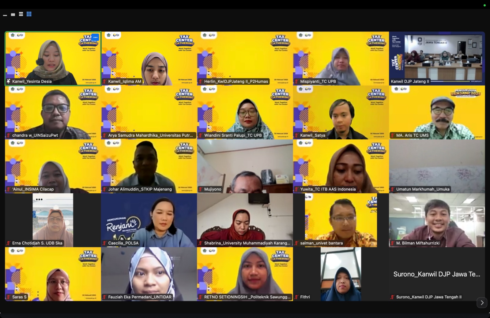 Sejumlah Tax Center dari berbagai perguruan tinggi di Jawa Tengah mengikuti kegiatan Tax Center Gathering 2025 yang diselenggarakan secara daring oleh Kantor Wilayah Direktorat Jenderal Pajak (Kanwil DJP) Jawa Tengah II (Selasa, 25/2). Kegiatan ini menjadi momen penting bagi akademisi untuk memperdalam pemahaman tentang peran strategis Tax Center dalam edukasi perpajakan.