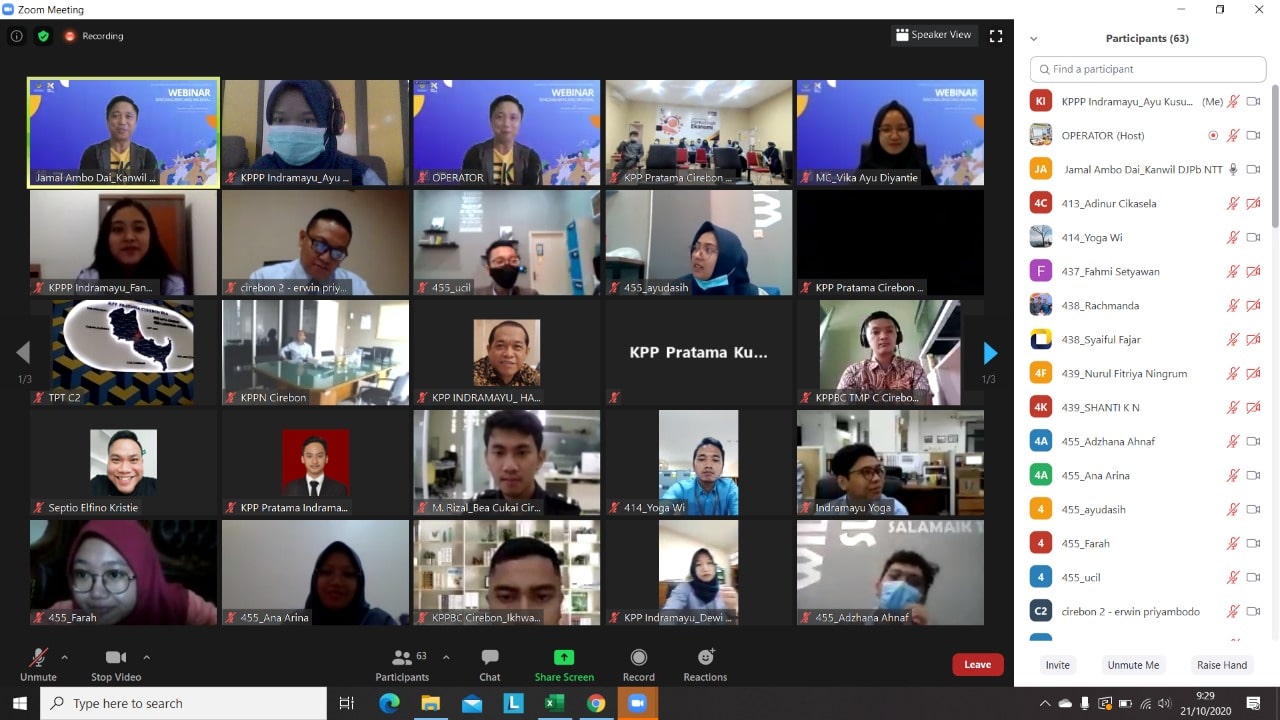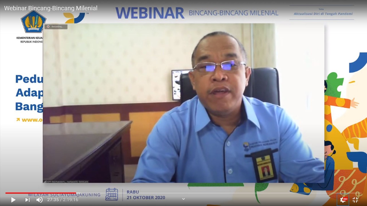 Memperingati Hari Oeang ke 74 di Lingkungan Kementerian Keuangan wilayah Suciayumajakuning, KPP Pratama Indramayu menggelar acara Bincang-Bincang Milenial: Aktualisasi Diri di Tengah Pandemi secara daring menggunakan aplikasi Zoom di Indramayu (Rabu, 21/10).