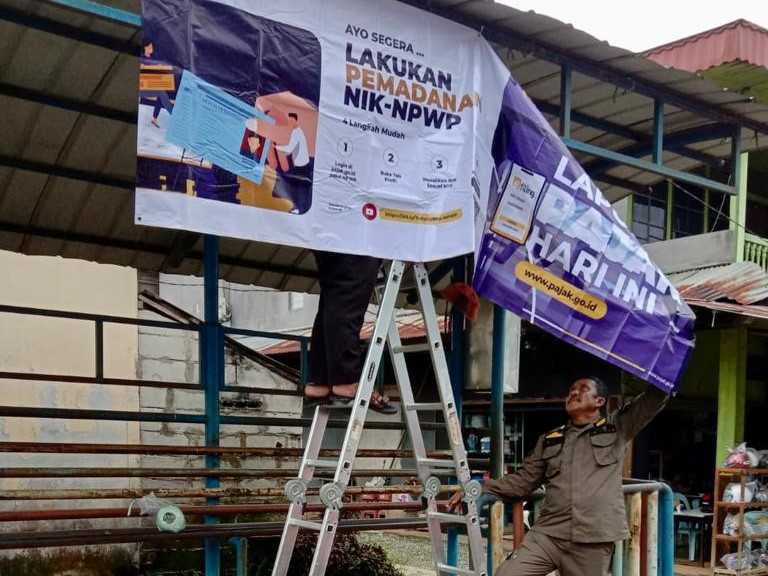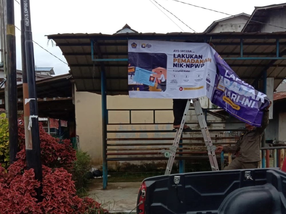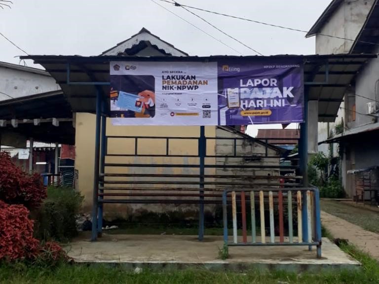 Kantor Pelayanan, Penyuluhan, dan Konsultasi Perpajakan (KP2KP) Bengkayang melakukan pemasangan spanduk sebagai media publikasi imbauan di halte Kecamatan Sanggau Ledo (Selasa, 14/3). Publikasi yang dimaksud mengandung pelaporan SPT Tahunan dan pemadanan NIK-NPWP.