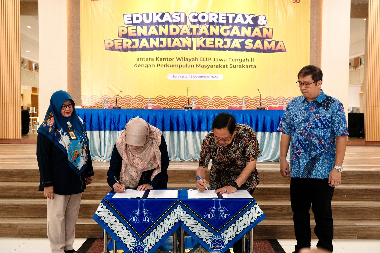 Kantor Wilayah Direktorat Jenderal Pajak (Kanwil DJP) Jawa Tengah II kembali memperpanjang kerja sama dengan Perkumpulan Masyarakat Surakarta (PMS) melalui penandatanganan perjanjian kerja sama dan edukasi Coretax yang berlangsung di Gedung Pertemuan PMS Surakarta, Kota Surakarta (Rabu, 18/12). Acara ini dihadiri sekitar 200 pengusaha dan masyarakat Surakarta.
