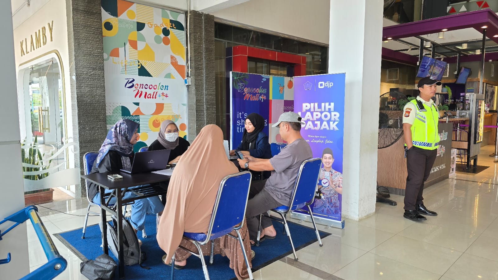 Kantor Pelayanan Pajak (KPP) Pratama Bengkulu Satu membuka Pojok Pajak di Bencoolen Mall, Kecamatan Ratu Samban, Kota Bengkulu (Minggu, 16/3). Kegiatan tersebut dilaksanakan untuk memudahkan wajib pajak dalam melaksanakan kewajiban perpajakannya terutama dalam melaporkan SPT Tahunan tanpa harus datang langsung ke kantor pajak.