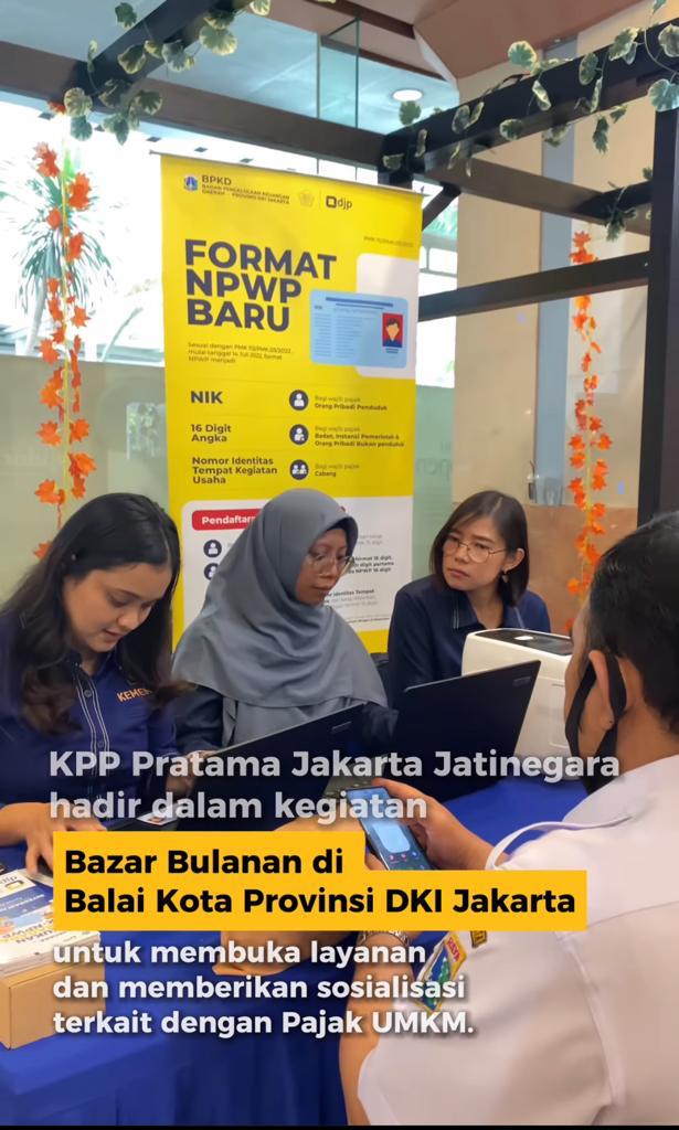Kantor Pelayanan Pajak (KPP) Pratama Jakarta Jatinegara berupaya untuk lebih mendekatkan diri dengan masyarakat dan memberikan layanan yang lebih baik dengan membuka pojok pajak layanan di Bazar Bulanan Balai Kota Provinsi DKI Jakarta. Kegiatan ini sebagai bentuk kerjasama dengan Suku Dinas Perindustrian, Perdagangan, Koperasi, Usaha Kecil dan Menengah (PPKUKM) Kota Administrasi Jakarta Timur (Rabu, 11/10).