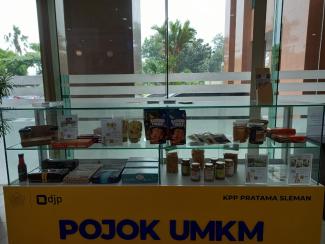 Kantor Pelayanan Pajak (KPP) Pratama Sleman bekerja sama dengan para Wajib Pajak Usaha Mikro, Kecil, dan Menengah (UMKM) menyelenggarakan program Pojok UMKM di Tempat Pelayanan Terpadu (TPT) KPP Pratama Sleman (Selasa, 1/11). Program ini bertujuan untuk membantu Wajib Pajak UMKM dalam memasarkan produknya dengan meletakkan produk-produk yang akan dipasarkan di sebuah etalase di ruang tunggu TPT.