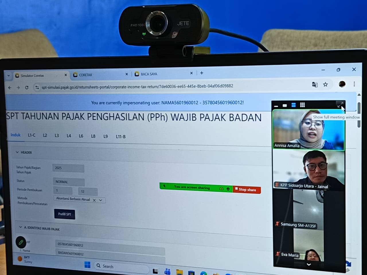 Kelas pajak daring berlangsung dengan berfokus pada simulasi pengisian Surat Pemberitahuan (SPT) Tahunan Pajak Penghasilan (PPh) Badan untuk sektor usaha mikro, kecil, dan menengah (UMKM), jasa, serta perdagangan menggunakan Simulator Coretax DJP melalui beberapa skenario yang telah disiapkan oleh tim penyuluh pajak.