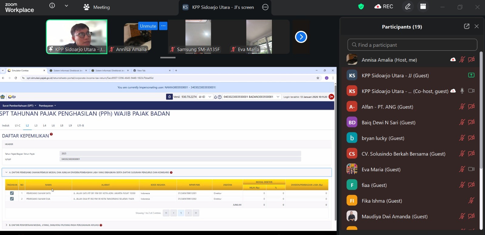 Para peserta kelas pajak daring mengikuti tahap demi tahap pengisian SPT Tahunan PPh Badan sesuai panduan yang dicontohkan oleh Annisa dan Jainal.