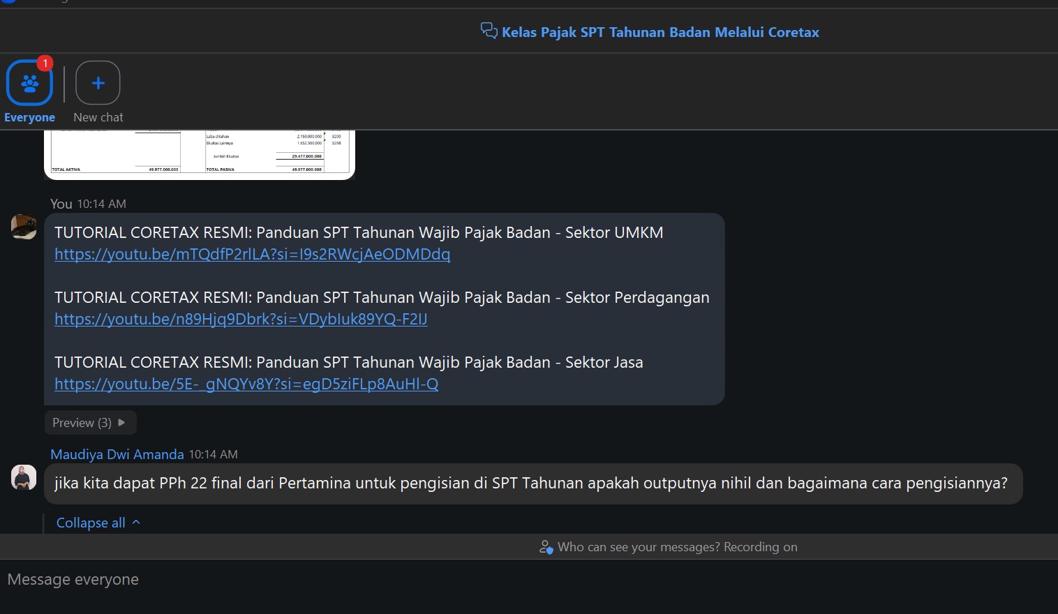 “Selamat datang dalam kelas pajak daring simulasi pengisian SPT Tahunan PPh Badan. Pelaksanaan administrasi perpajakan tidak selalu dimulai dari aturan yang rumit, tetapi bisa dari pemahaman sederhana dan pengalaman langsung. Dengan adanya kelas pajak ini, kami berharap pelaporan pajak tidak lagi terasa sebagai kewajiban yang berat, melainkan bagian dari proses yang bisa dijalani dengan lebih tenang dan pasti,” sambut Annisa Amalia, penyuluh pajak.