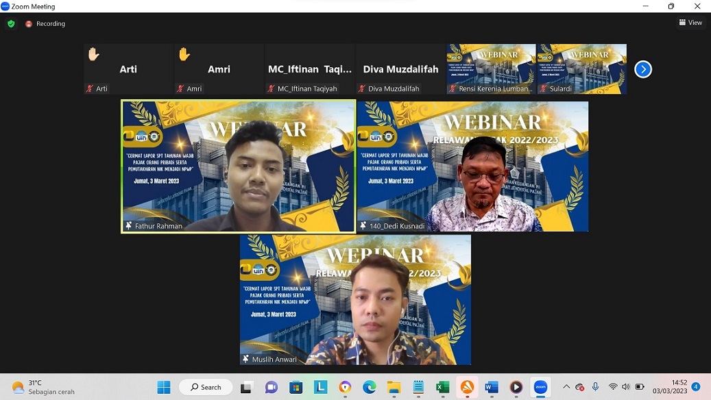 Kantor Wilayah DJP Banten bersama Tax Center Universitas Universitas Islam Negeri (UIN) Syarif Hidayatullah Jakarta melakukan webinar dengan tema "Cermat Lapor SPT Tahunan Wajib Pajak Orang Pribadi Serta Pemutakhiran NIK menjadi NPWP" kepada puluhan mahasiswa secara daring melalui aplikasi Zoom di Kota Serang, Banten (Jumat, 3/3).