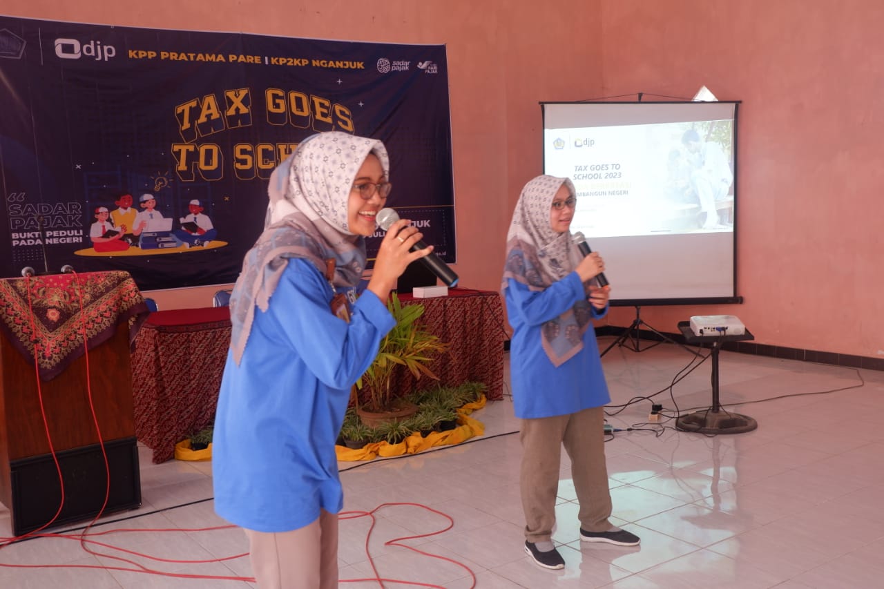 Kantor Pelayanan Pajak (KPP) Pratama Pare bekerja sama dengan Kantor Pelayanan, Penyuluhan, dan Konsultasi Perpajakan (KP2KP) Nganjuk menggelar kegiatan Tax Goes to School (TGTS) di Aula Sekolah Menengah Kejuruan (SMK) Kosgoro, Nganjuk, Jawa Timur (Kamis, 20/7). Kegiatan yang bertemakan “Muda Berkreasi Membangun Negeri” ini diikuti oleh puluhan Siswa SMK Kosgoro Nganjuk.
