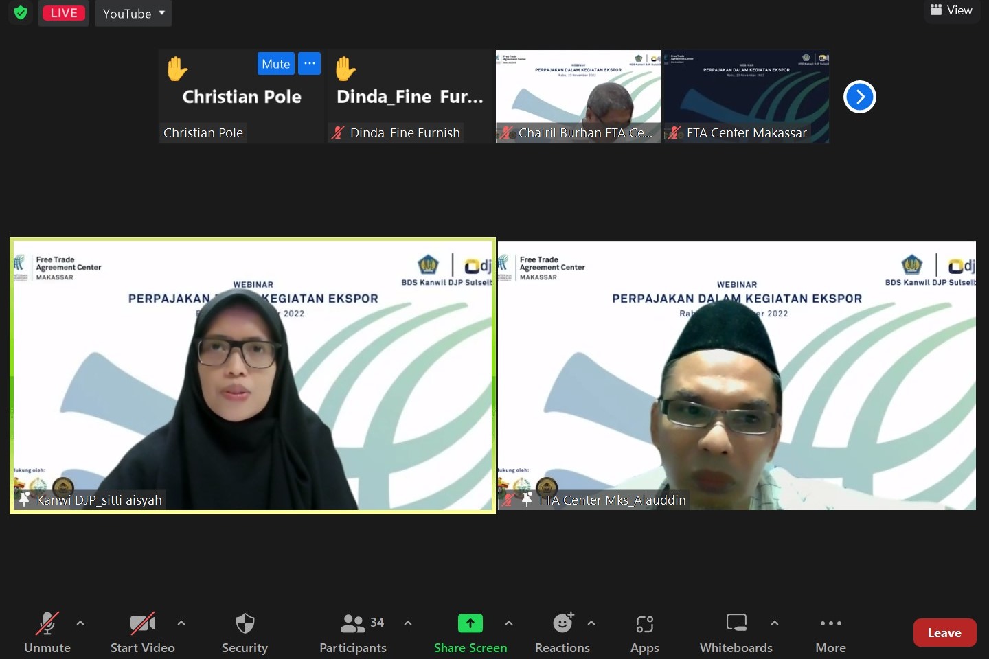 Kanwil DJP Sulawesi Selatan, Barat, dan Tenggara (Sulselbartra) bekerja sama dengan Free Trade Agreement (FTA) Center Makassar menyelenggarakan acara Business Development Services (BDS) dengan tema ''Perpajakan Dalam Kegiatan Ekspor" yang dilangsungkan secara daring melalui Zoom Meeting (Rabu, 23/11). Penyuluh Pajak Kanwil DJP Sulselbarta Sitti Aisyah berperan sebagai narasumber pada acara ini, ia memandu jalannya acara langsung dari ruang studio Kanwil DJP Sulselbartra, Kota Makassar.