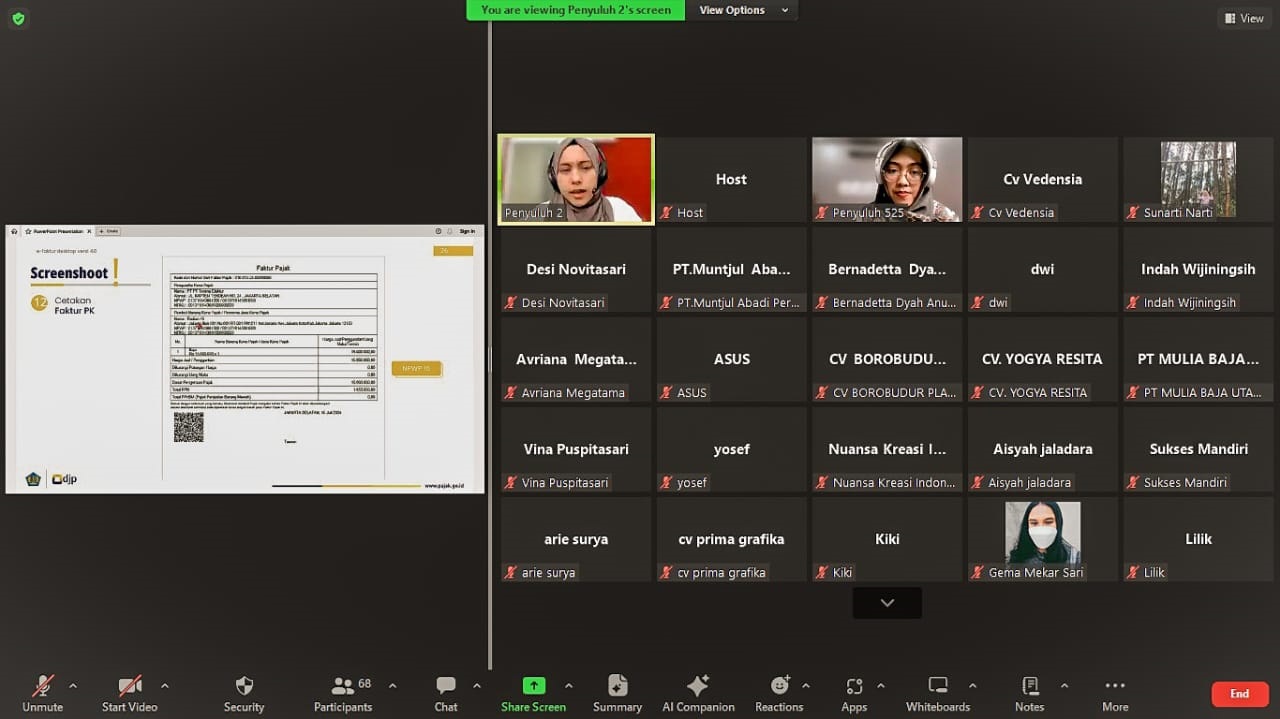 KPP Pratama Klaten mengadakan sosialisasi perpajakan secara daring melalui Zoom Meeting yang diikuti oleh 80 Wajib Pajak Orang Pribadi dan Badan yang berstatus Pengusaha Kena Pajak (PKP). Acara ini bertujuan memberikan edukasi mengenai pembaruan aplikasi e-Faktur dan e-Nofa sesuai dengan PENG-18/PJ.09/2024 tentang Pembaruan Daftar Layanan Perpajakan Berbasis NPWP 16 Digit, Nomor Identitas Tempat Kegiatan Usaha (NITKU), dan NPWP 15 Digit (Senin, 22/7).