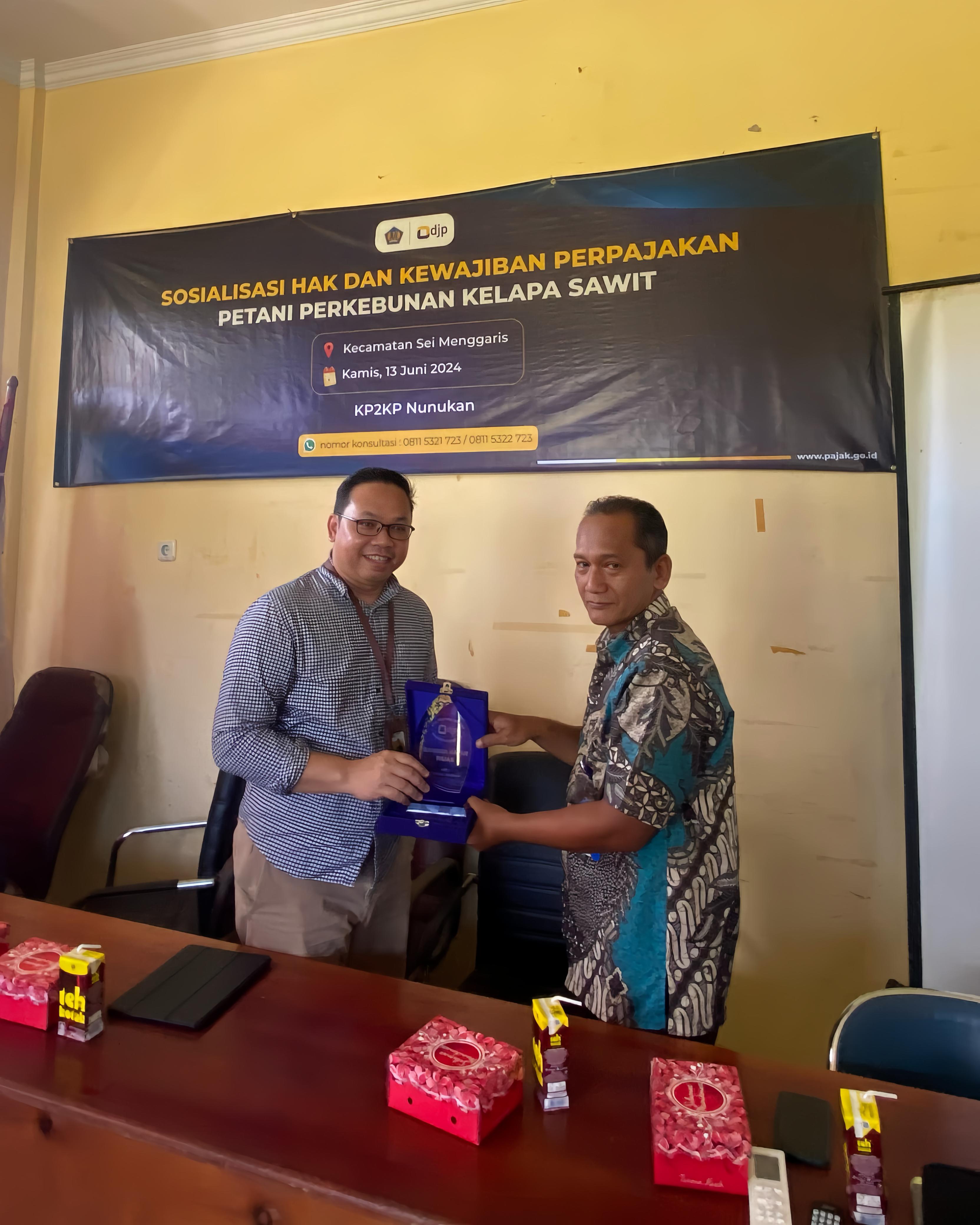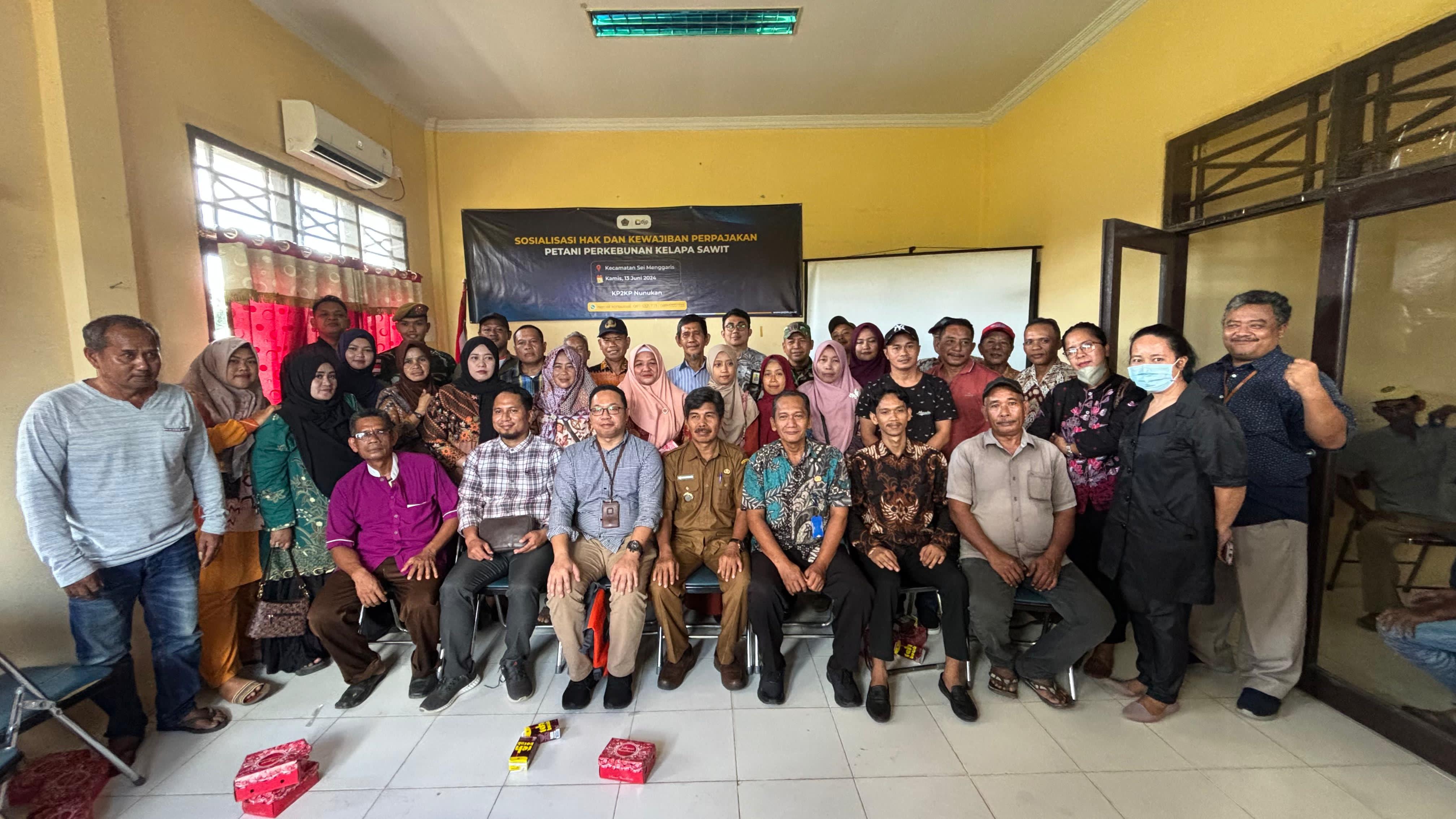 Kantor Pelayanan Pajak (KPP) Pratama Tarakan bersama Kantor Pelayanan, Penyuluhan, dan Konsultasi Perpajakan (KP2KP) Nunukan menggelar acara sosialisasi kepada petani perkebunan kelapa sawit di Sei Menggaris, Kab. Nunukan (Kamis, 27/6). Sebanyak 30 peserta hadir dalam kegiatan sosialisasi ini.