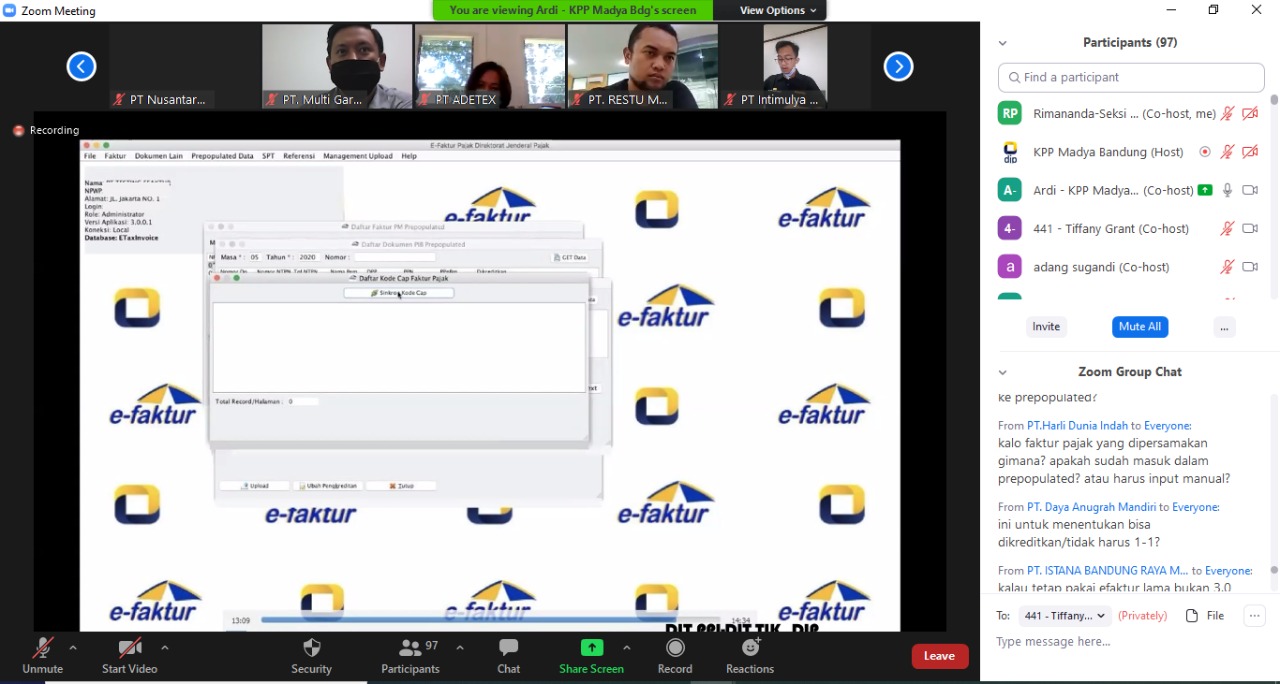 KPP Madya Bandung mengadakan Kelas Pajak daring dengan mengangkat topik Implementasi e-Faktur 3.0 dan e-Objection melalui Aplikasi Zoom Cloud Meeting di Bandung (Kamis, 24/9). Kelas yang dihadiri oleh 90 wajib pajak berstatus Pengusaha Kena Pajak (PKP) di KPP Madya Bandung ini bertujuan untuk memperkenalkan fitur Prepopulated Pajak Masukan dan Prepopulated SPT Masa PPN pada e-Faktur 3.0, serta fitur e-Objection yang kini telah tersedia di laman djponline.pajak.go.id.