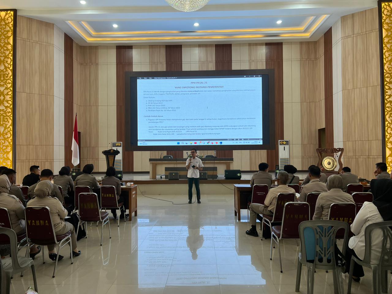 Kantor Pelayanan Pajak (KPP) Pratama Natar memenuhi undangan dari Kepolisian Negara Republik Indonesia Daerah (Polda) Lampung untuk memberikan sosialisasi terkait pemotongan dan pemungutan pajak atas transaksi bendaharawan instansi pemerintah di lingkungan Polda Lampung di Aula Polda Lampung, Jalan Terusan Ryacudu No. 01, Way Huwi, Jati Agung, Lampung Selatan, Lampung (Senin, 4/9).