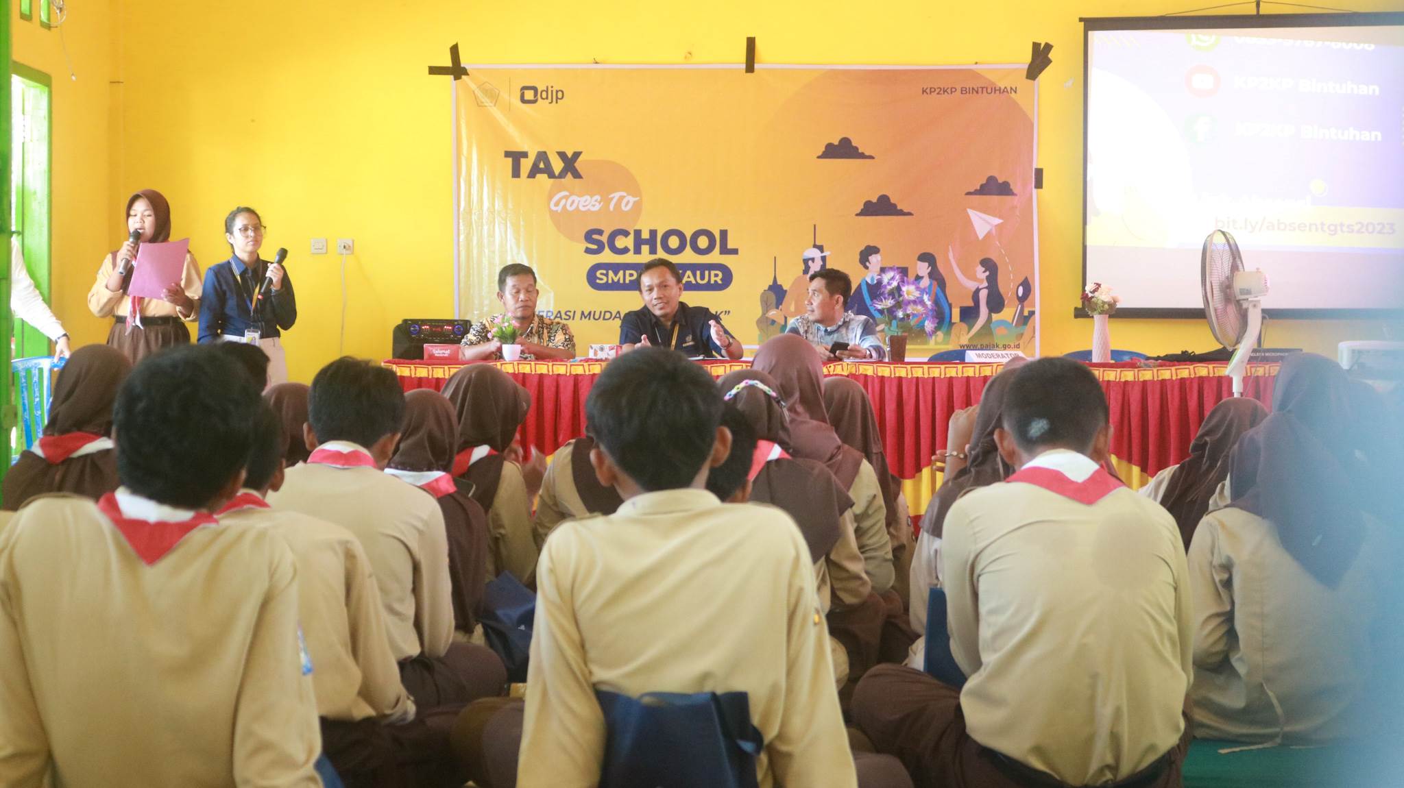 Kantor Pelayanan Penyuluhan dan Konsultasi Perpajakan (KP2KP) Bintuhan sukses menggelar acara Tax Goes To School 2023 di SMP Negeri 1 Kaur, Desa Jembatan Dua, Kecamatan Kaur Selatan, Kabupaten Kaur, Provinsi Bengkulu. Acara ini bertujuan memperkenalkan dunia perpajakan kepada siswa-siswi dengan cara yang ceria dan interaktif. Suasana antusiasme dan interaksi dari siswa-siswi yang tinggi mencirikan acara ini sejak awal hingga akhir (Rabu, 27/9).