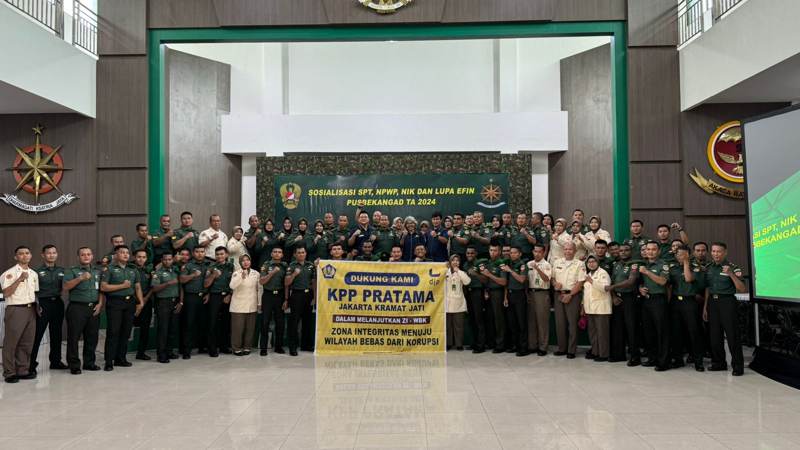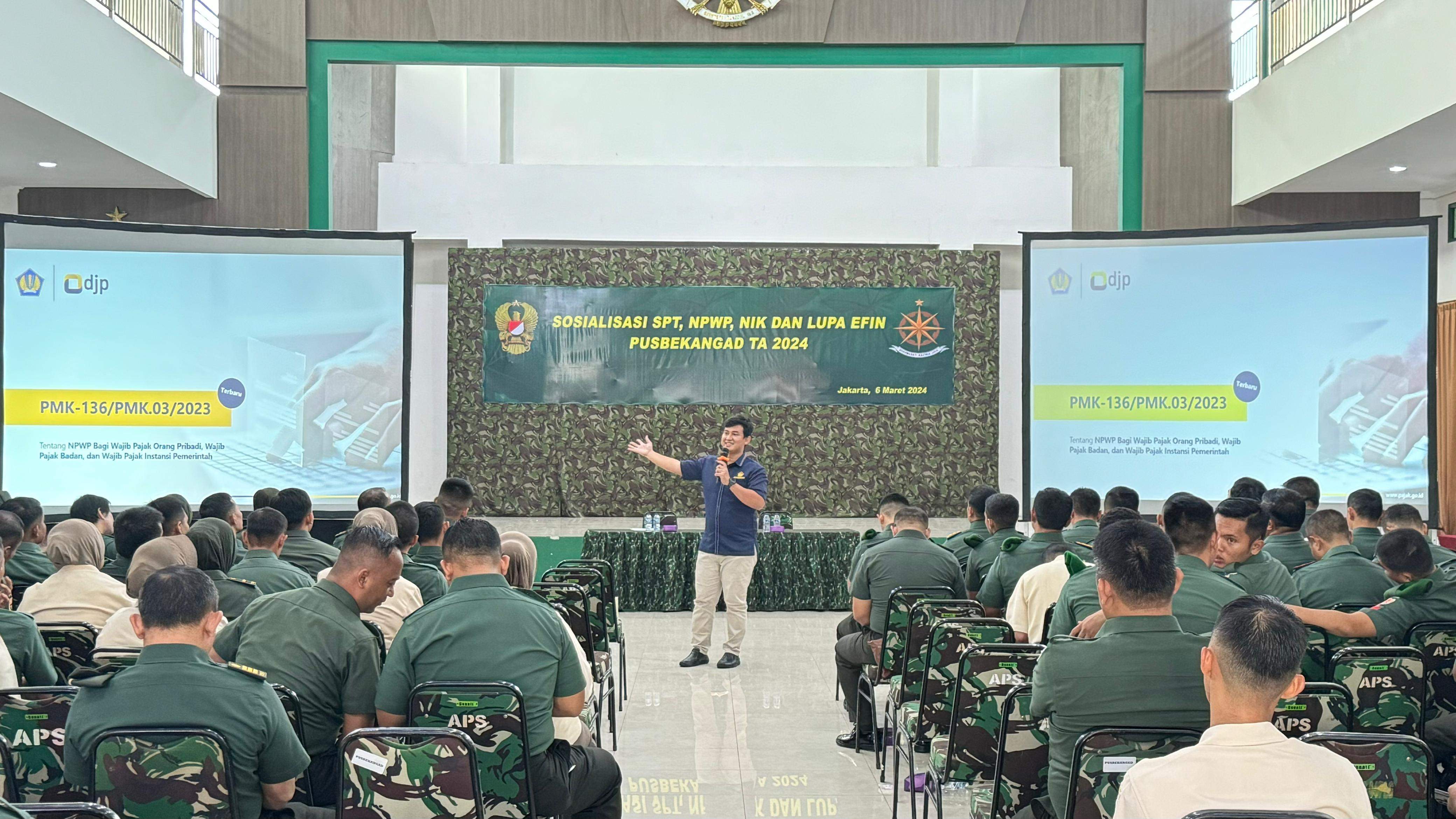 Kantor Pelayanan Pajak (KPP) Pratama Jakarta Kramat Jati tetap giat memenuhi undangan dari Pusat Pembekalan Angkutan Darat (Pusbekangad) untuk menyelenggarakan Kelas Pajak Surat Pemberitahuan (SPT) Tahunan Pajak Penghasilan (PPh) Orang Pribadi Tahun Pajak 2023 serta pemadanan Nomor Induk Kependudukan (NIK) menjadi Nomor Pokok Wajib Pajak (NPWP) di Aula Gedung Utama Pusbekangad Jl. Raya Bogor, Kramat Jati, Jakarta Timur, DKI Jakarta (Rabu, 6/3).