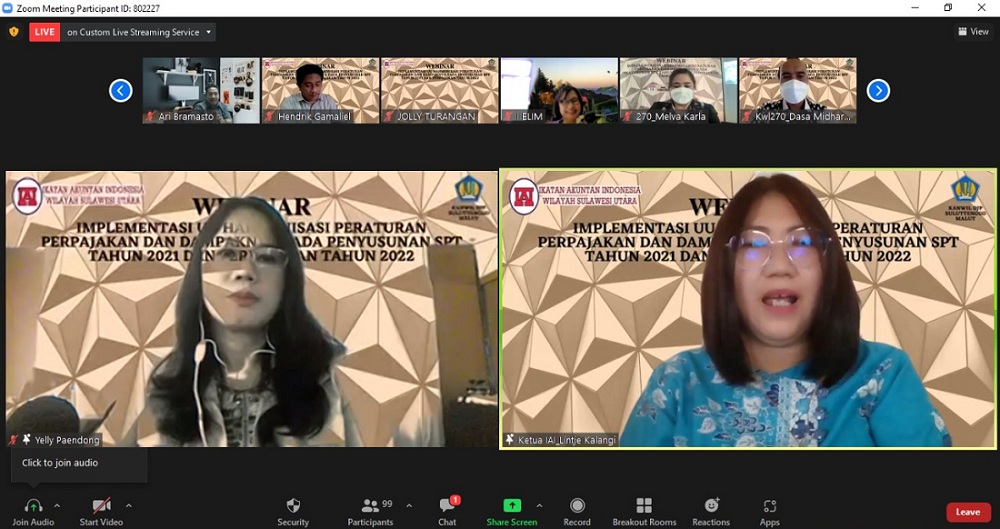 Kegiatan tersebut mengambil tema Implementasi Undang-Undang Harmonisasi Peraturan Perapajakan (UU HPP) pada Penyusunan dan Pelaporan Surat Pemberitahuan (SPT) Tahunan. Dalam kegiatan ini dihadiri ratusan peserta yang merupakan anggota IAI Wilayah Sulawesi Utara secara daring maupun luring.