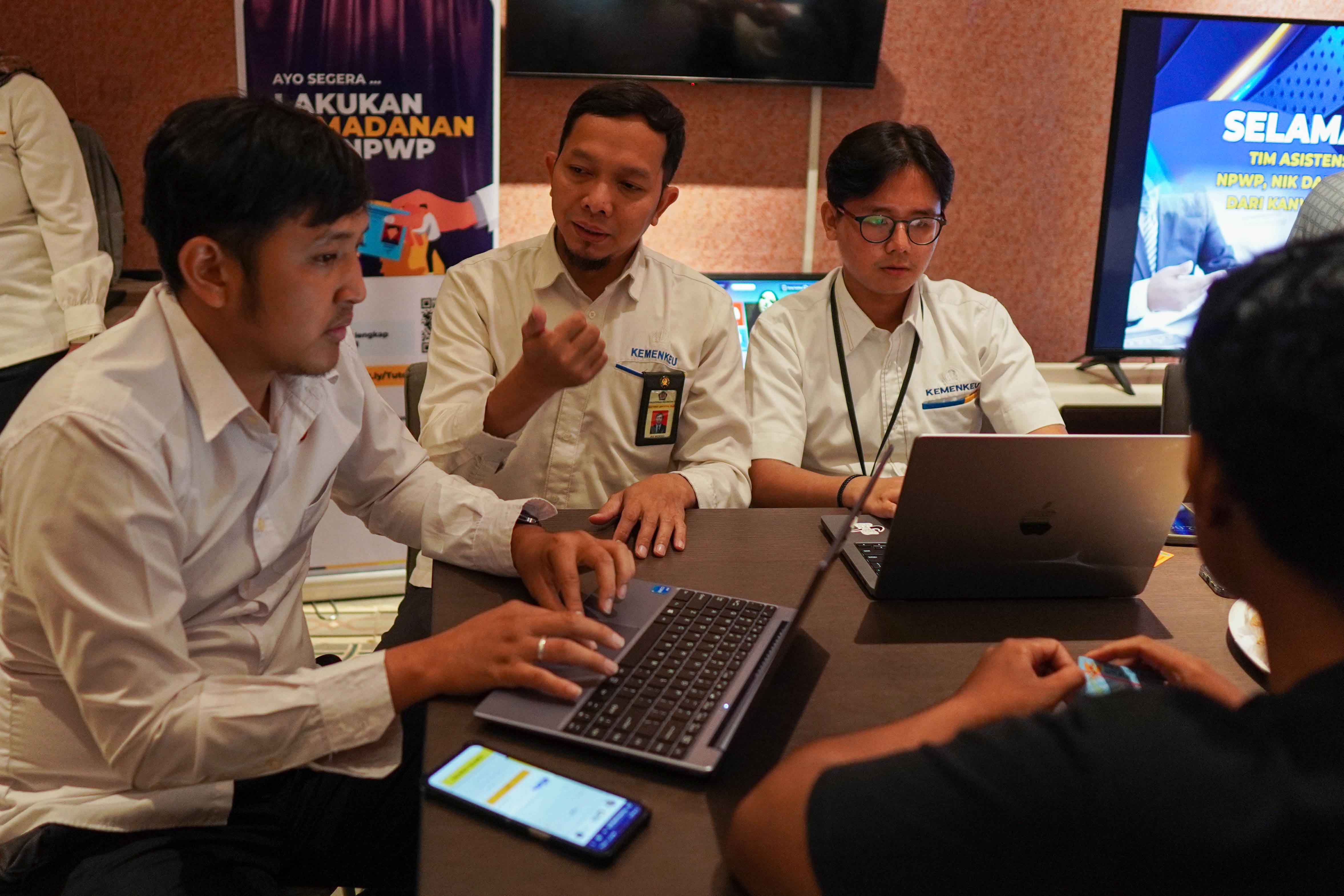 Para peserta secara bergantian masuk ke ruangan aula untuk mendapatkan layanan. Kegiatan asistensi diwarnai dengan antusiasme dari para peserta yang bertanya dan mengikuti rangkaian proses pemadanan NIK-NPWP dan pelaporan SPT Tahunan.