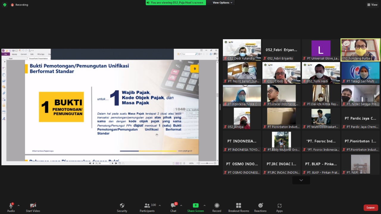 Kantor Pelayanan Pajak (KPP) Penanaman Modal Asing (PMA) Satu mengadakan Kelas Pajak E-Bupot Unifikasi (Selasa, 14/6). Kelas pajak yang berlangsung selama dua jam mulai pukul 09.00 WIB sampai dengan 11.00 WIB ini diikuti oleh 100 wajib pajak secara daring.