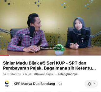 Kantor Pelayanan Pajak (KPP) Madya Dua Bandung kembali merilis Siniar Madu Bijak (Madya Dua Bincang Pajak) dengan tajuk “Siniar Madu Bijak #5 Seri KUP - SPT dan Pembayaran Pajak, Bagaimana sih Ketentuannya?” di kanal Youtube resmi KPP Madya Dua Bandung (Senin, 18/9).