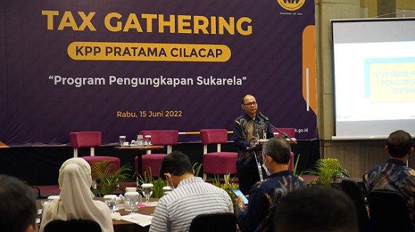 Kantor Pelayanan Pajak (KPP) Pratama Cilacap menyelenggarakan Tax Gathering Program Pengungkapan Sukarela di Favehotel Cilacap, Kabupaten Cilacap (Rabu,15/6). Tax gathering ini diikuti oleh puluhan wajib pajak dari berbagai sektor dan dihadiri oleh perwakilan asosiasi seperti Himpunan Nelayan Seluruh Indonesia (HNSI) Kabupaten Cilacap, Ikatan Dokter Indonesia (IDI) Kabupaten Cilacap, dan Asosiasi Pengusaha Emas dan Permata Indonesia (APEPI) Kabupaten Cilacap.