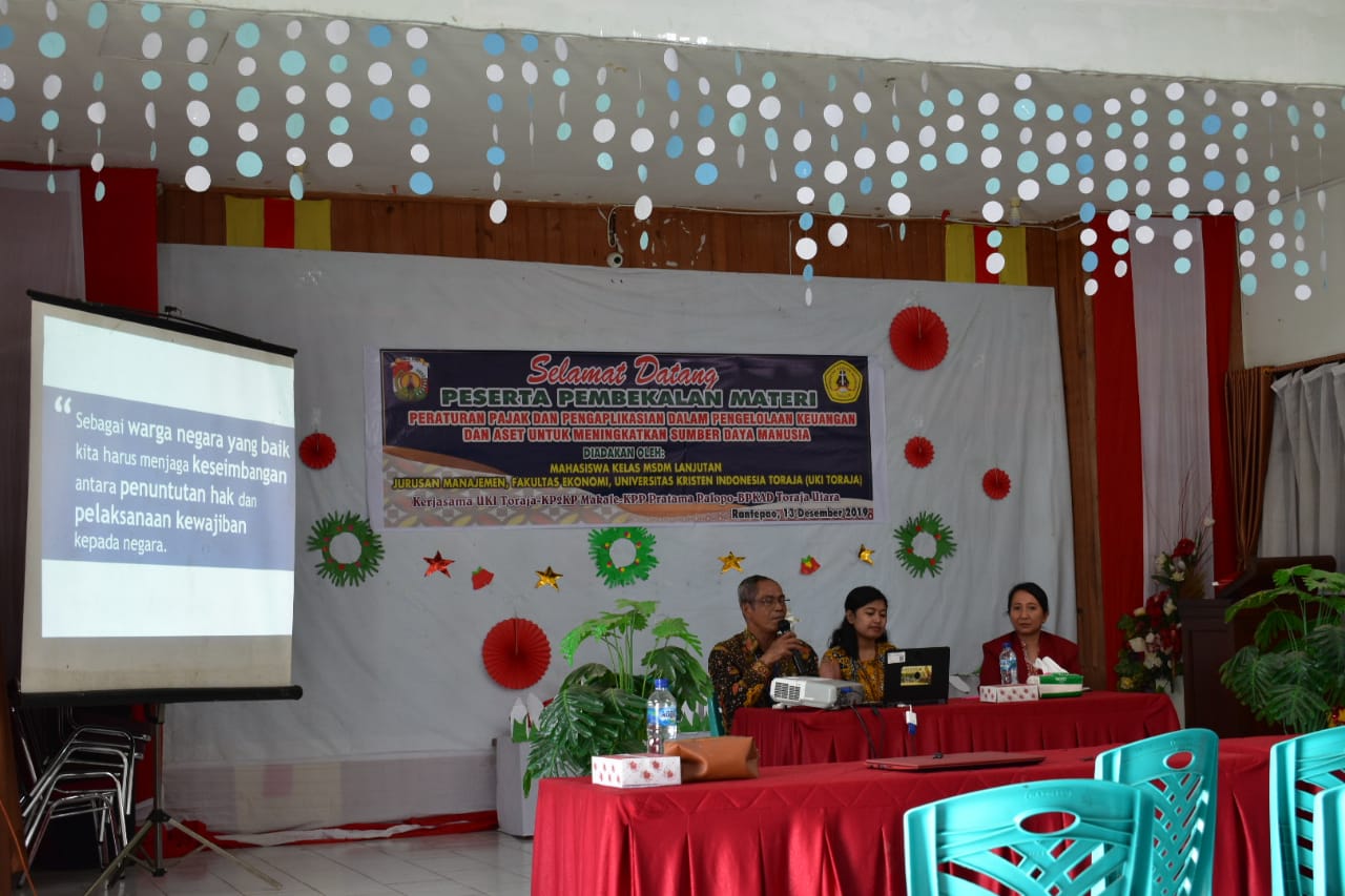 Perwakilan Kantor Pelayanan, Penyuluhan, dan Konsultasi Perpajakan (KP2KP) Makale menghadiri acara Pelatihan dan Edukasi Perpajakan yang diselenggrakan oleh mahasiswa Program Studi Manajemen Fakultas Ekonomi Universitas Kristen Indonesia (UKI) Toraja dalam rangka kegiatan pelatihan masyarakat (Jumat, 13/12). Perwakilan KP2KP Makale berperan sebagai narasumber dalam acara yang dilangsungkan di Kantor Pelayanan Gereja Toraja Jemaat Rantepao Kabupaten Toraja Utara ini.