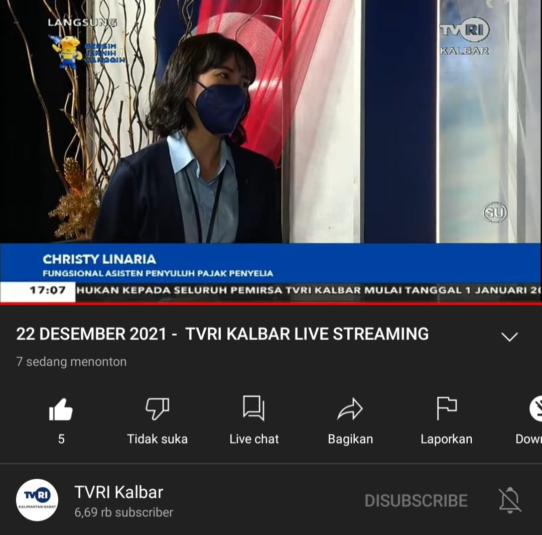 Penyuluh Pajak KPP Pratama Pontianak Barat membicarakan Undang-undang Harmonisasi Peraturan Perpajakan dalam acara Bincang 56 TVRI, Pontianak (Rabu, 22/12). Indaraputuri Nurmasruri dan Christy Linaria Penyuluh mengupas undang-undang ini terutama aspek Pajak Pertambahan Nilai dan Pajak Penghasilan selama satu jam.