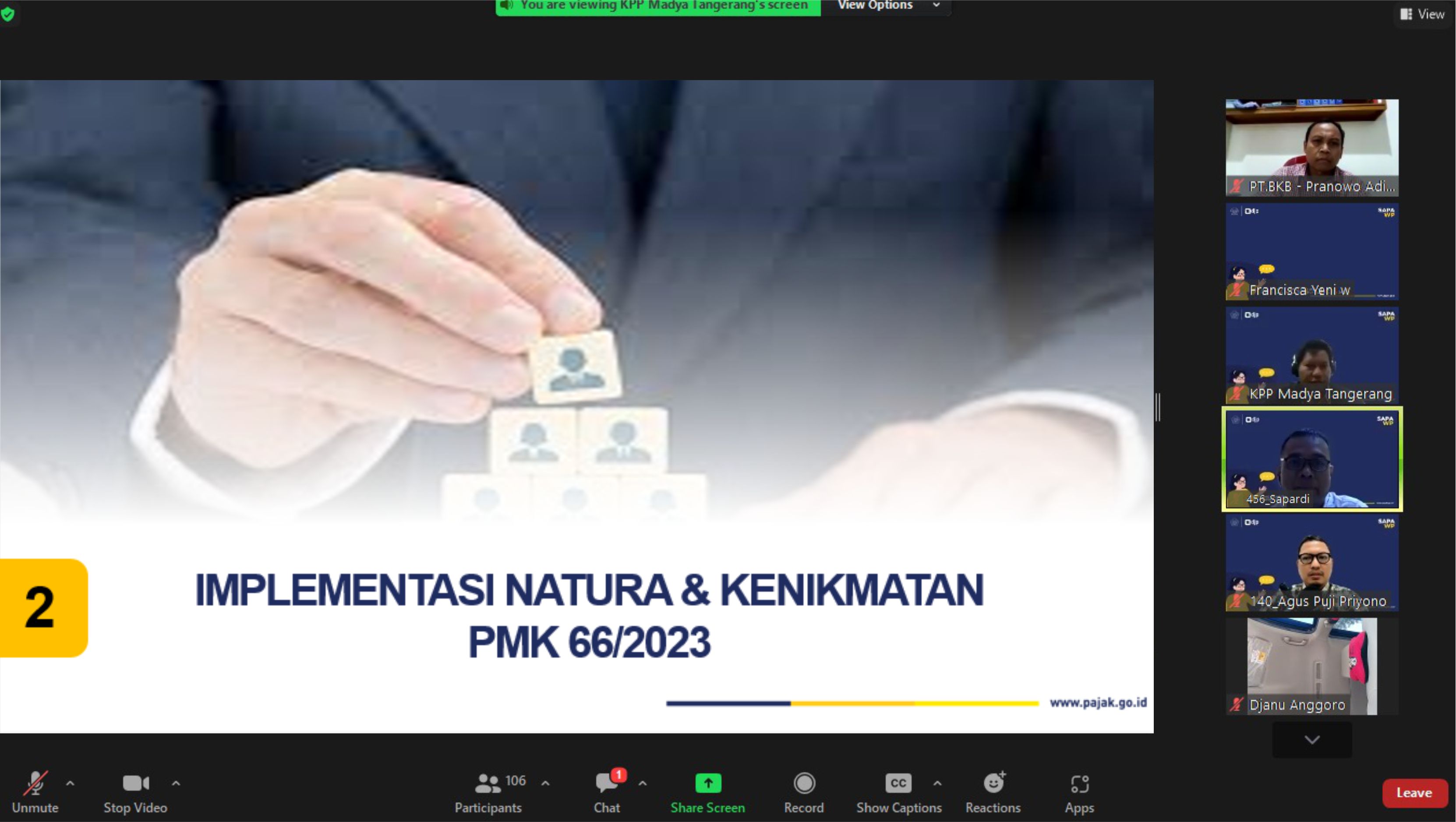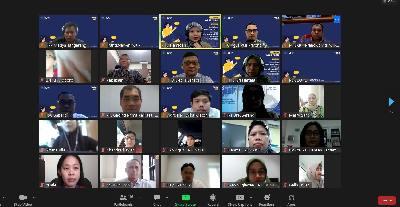 Kantor Pelayanan Pajak (KPP) Madya Dua Tangerang mengadakan kegiatan sapa pajak melalui aplikasi Zoom Cloud Meeting dengan materi Peraturan Menteri Keuangan Nomor 66 tahun 2023 kepada 116 wajib pajak di KPP Madya Dua Tangerang, Blok U No. 5, Jalan Scientia Boulevard, Curug Sangereng, Kecamatan Kelapa Dua, Kabupaten Tangerang, Banten (Kamis, 20/7). Kegiatan sapa pajak ini merupakan hasil dari kolaborasi dengan Kanwil DJP Banten dan KPP Madya Tangerang.