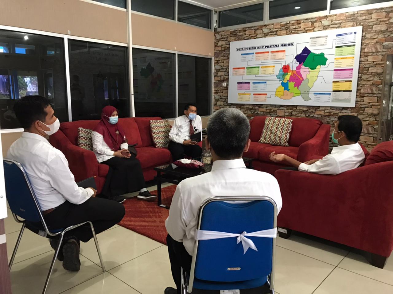 Kepala KPP Pratama Madiun Santoso Dwi Prasetyo menerima kunjungan kerja dari Kepala Kantor Pelayanan Kekayaan Negara dan Lelang (KPKNL) Madiun Adi Wibowo beserta staf di ruang kerjanya di Madiun (Senin, 26/4). Ikut hadir menyambut kunjungan tersebut Kepala Seksi Ekstensifikasi dan Penyuluhan Muhammad Azis Romadhoni dan Kepala Seksi Pelayanan KPP Pratama Madiun Hevy Sugeng Prayitno.