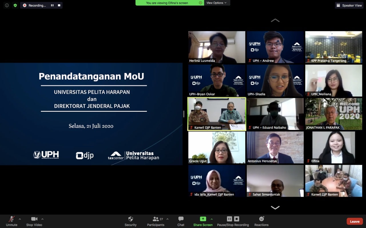 Kepala Kantor Wilayah DJP Banten Jatnika menandatangani MoU perpanjangan Kesepakatan Bersama penyelenggaraan Tax Center antara Direktorat Jenderal Pajak dengan Universitas Pelita Harapan (UPH) melalui media Zoom Meeting bertempat di Kantor Wilayah DJP Banten, Serang dan Universitas Pelita Harapan, Tangerang (Selasa, 21/7).